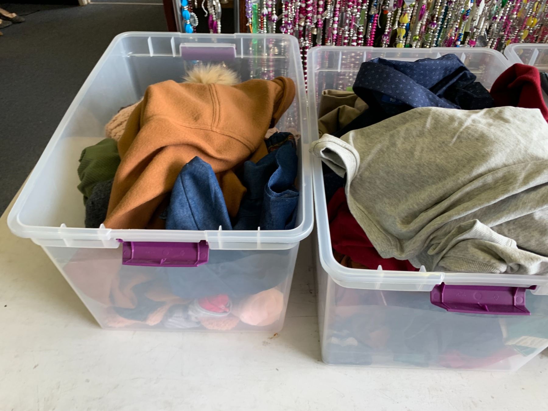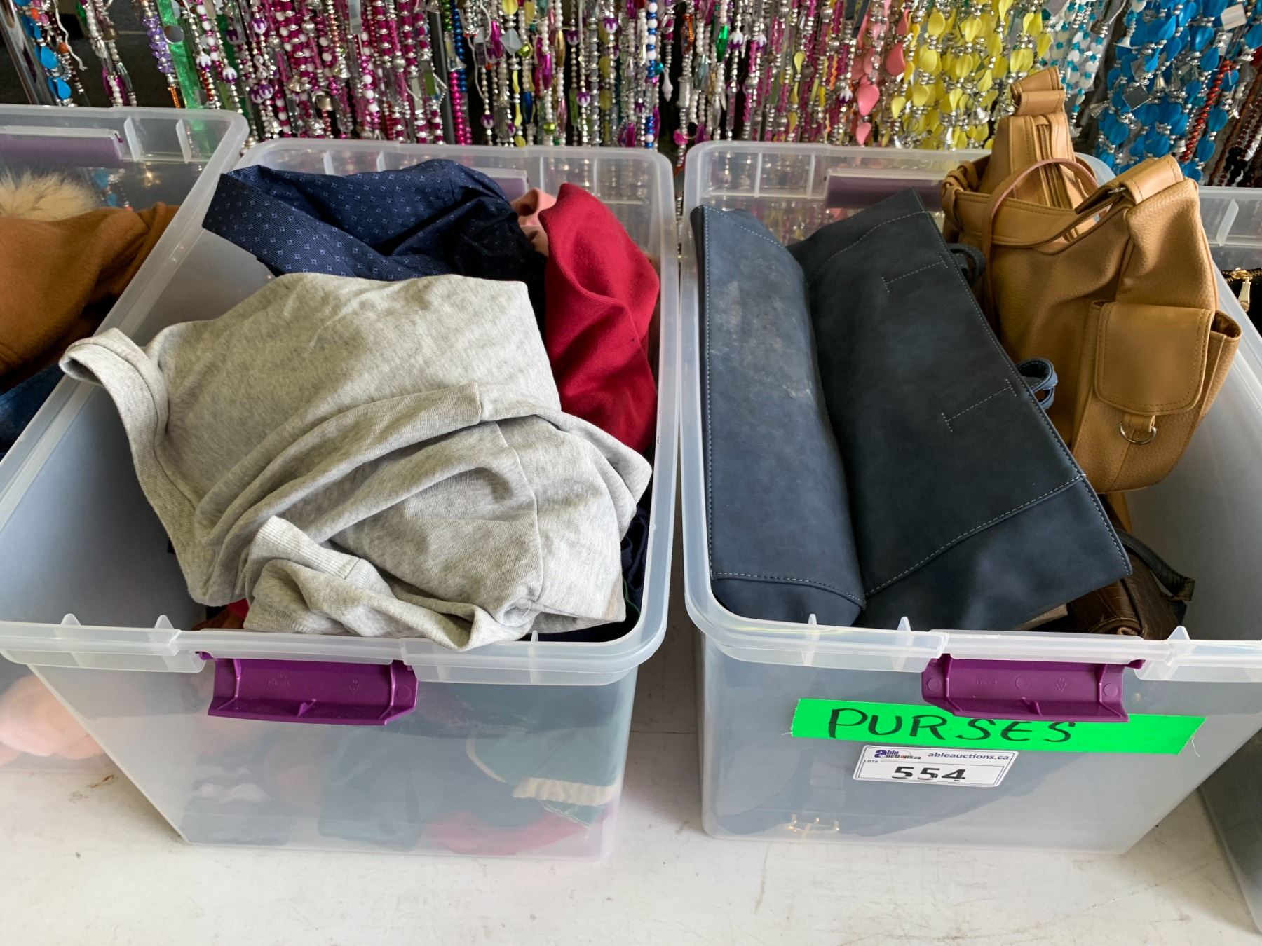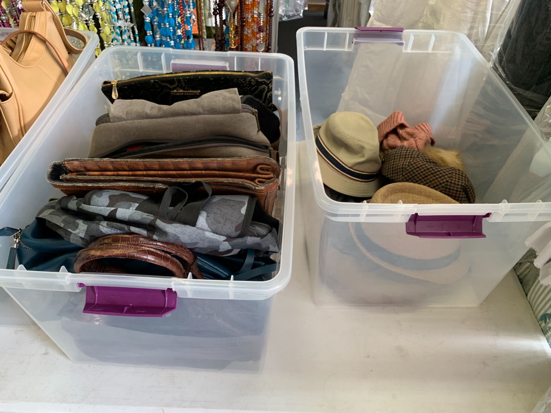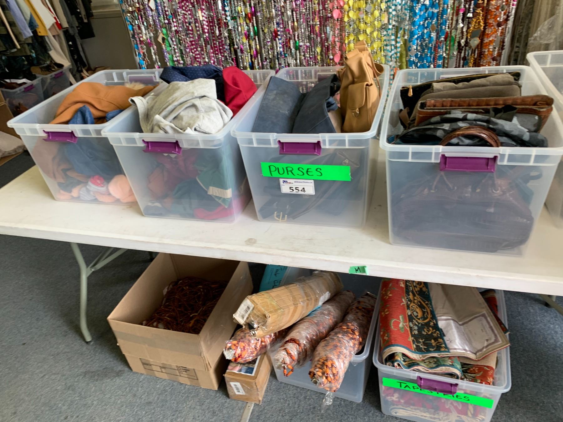 ASSORTED ITEMS INCLUDING; PURSES, HATS, CLOTHING & MORE (TABLE NOT INCLUDED)