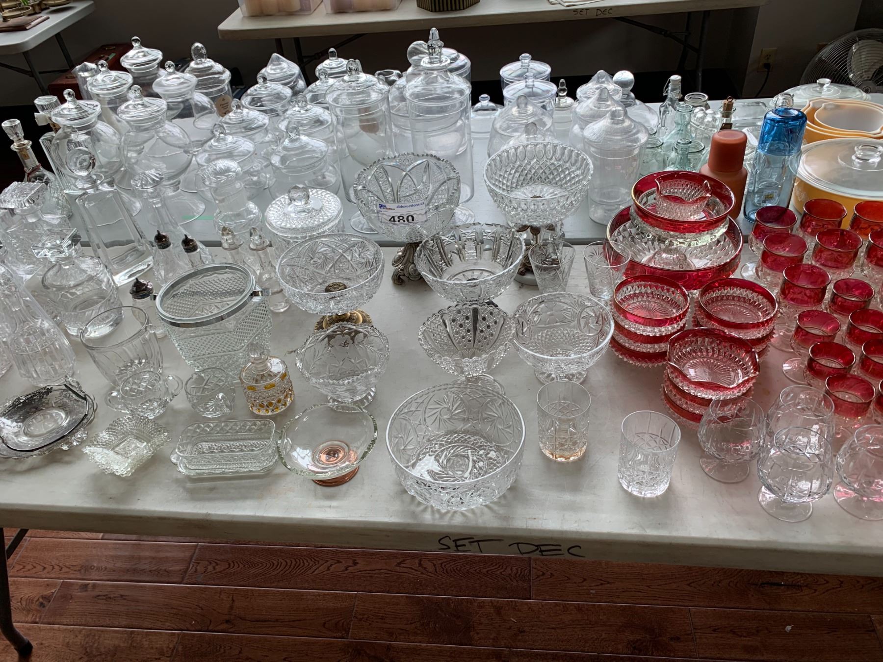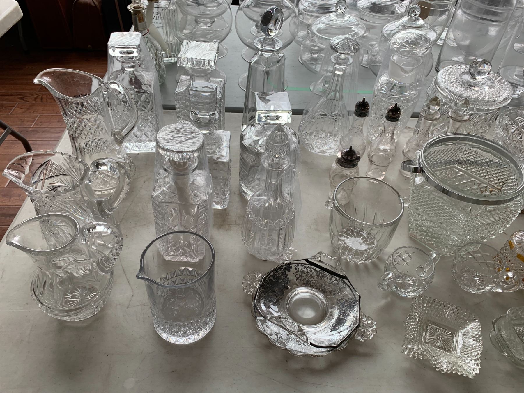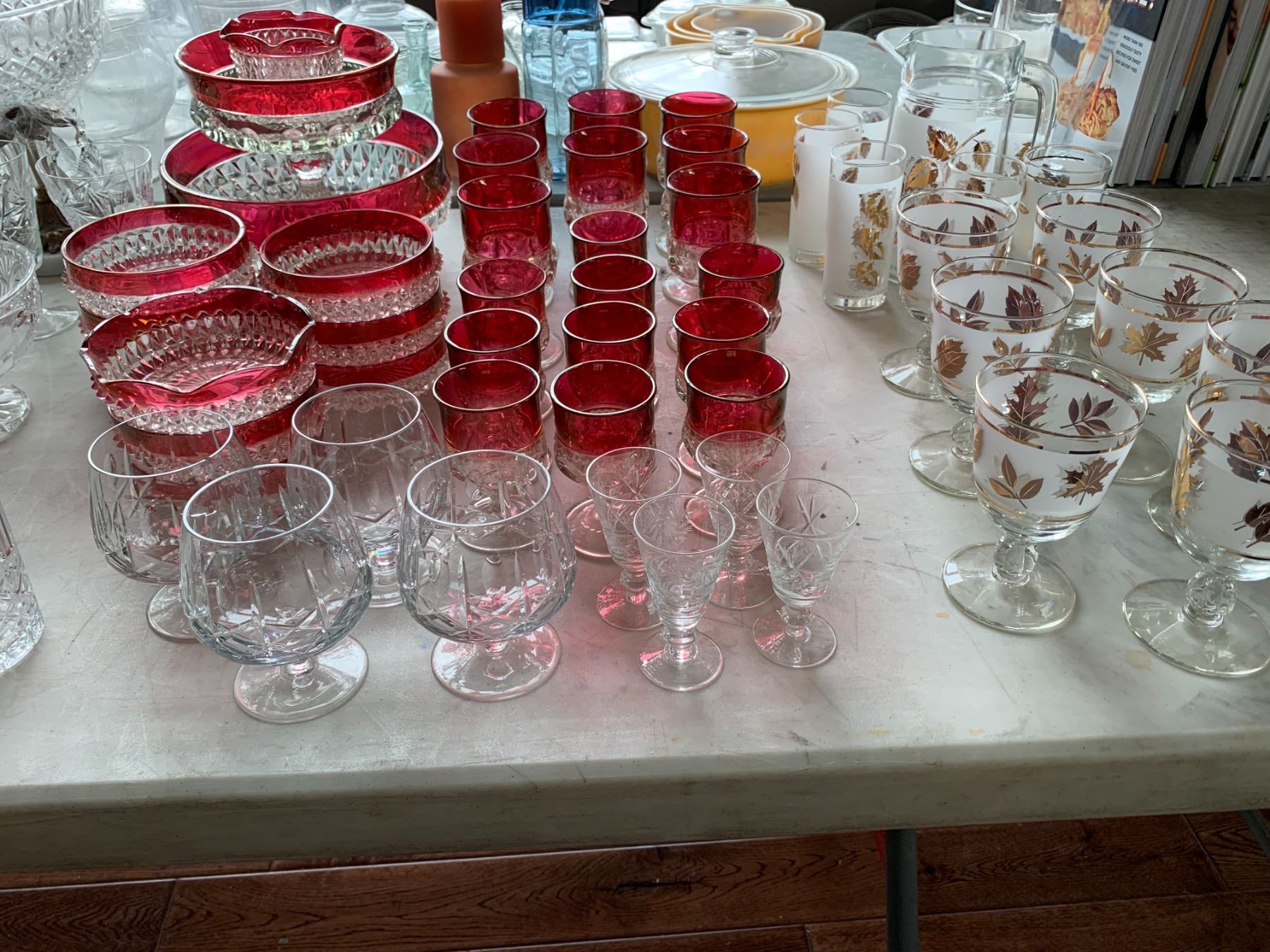 ASSORTED ITEMS INCLUDING; RASPBERRY GLASS, DECANTERS, GLASS PITCHERS & MORE (TABLE NOT INCLUDED)