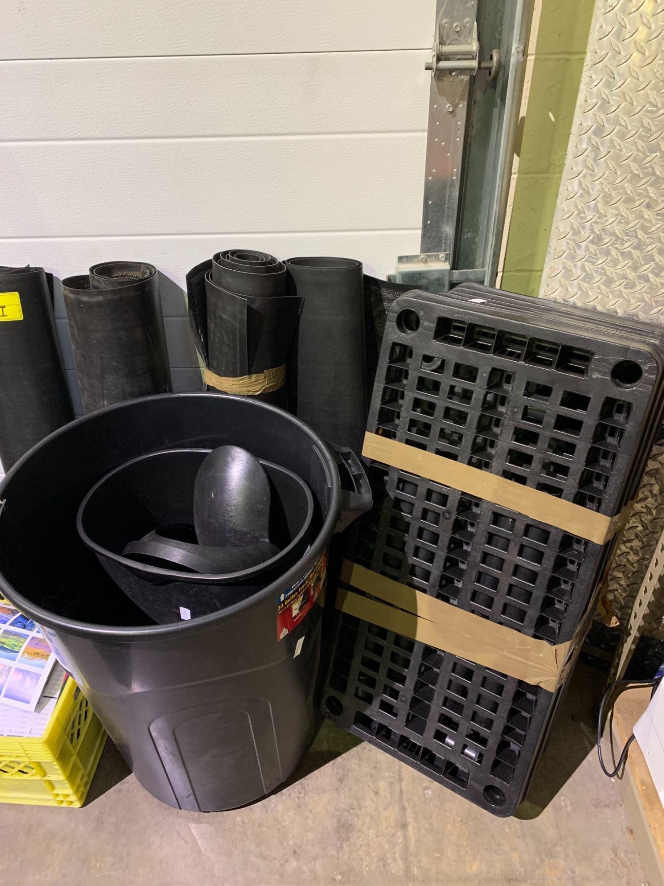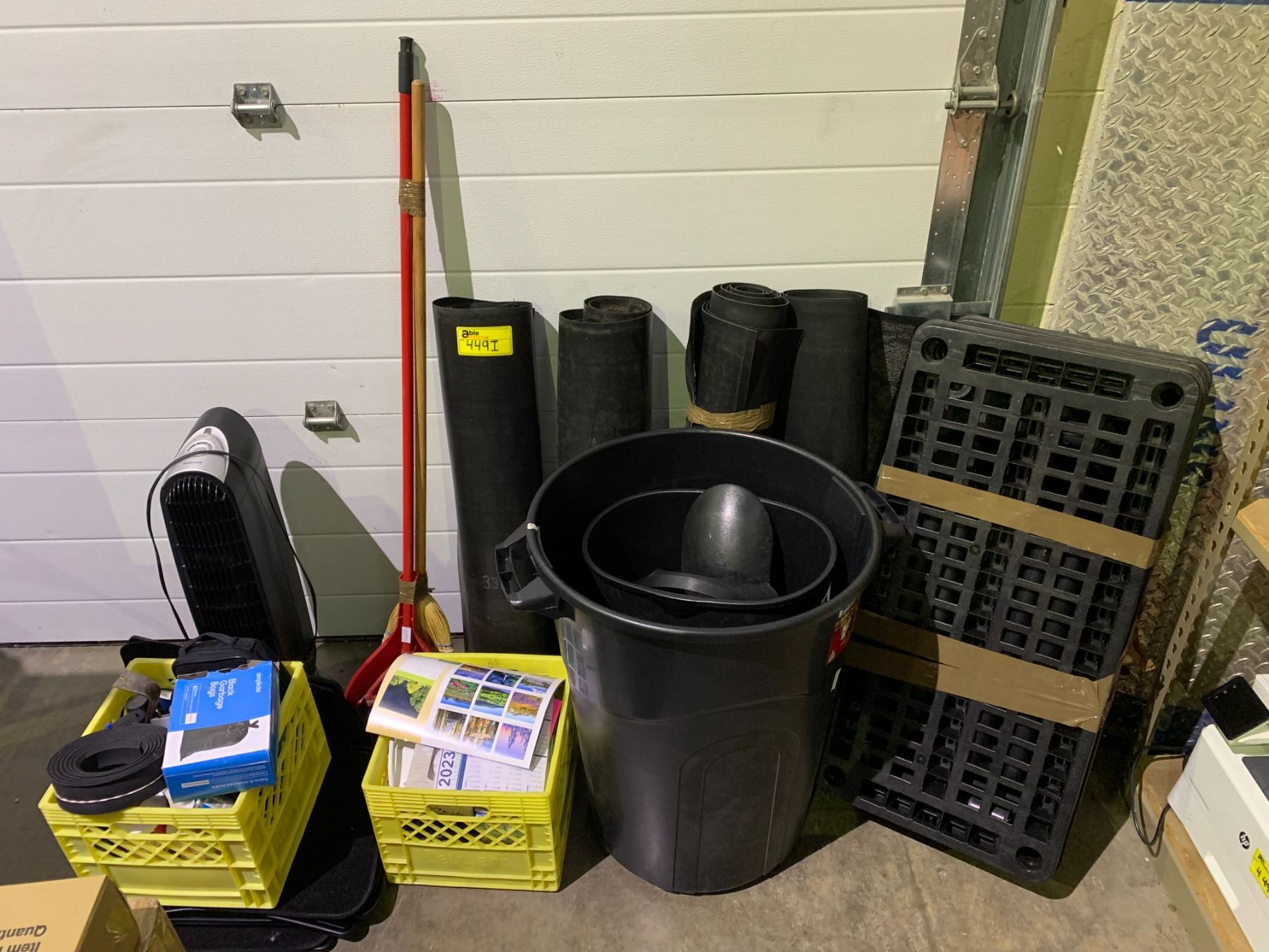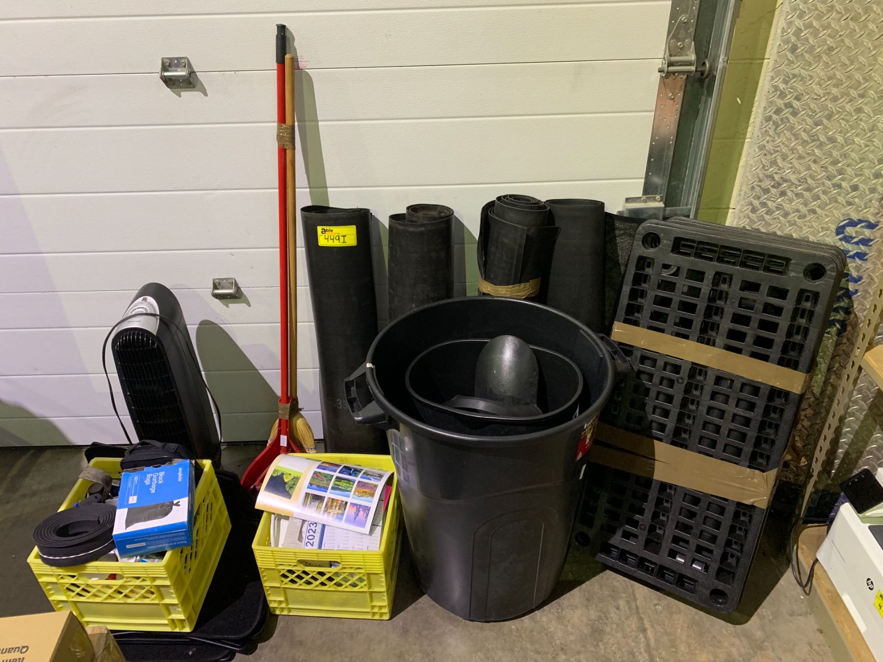 ASSORTED ITEMS INCLUDING; RESIN SHELVING, RUBBER FLOOR MATS, WASTE BINS & MORE