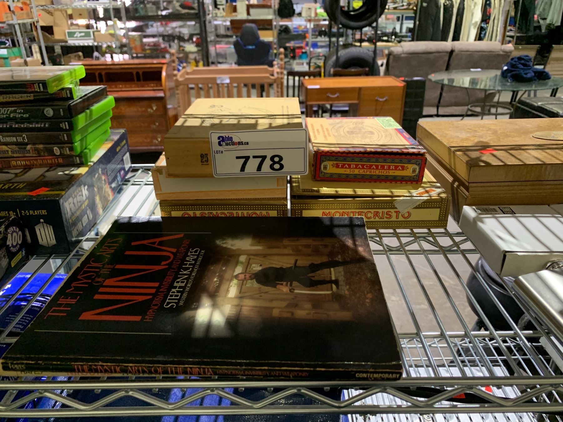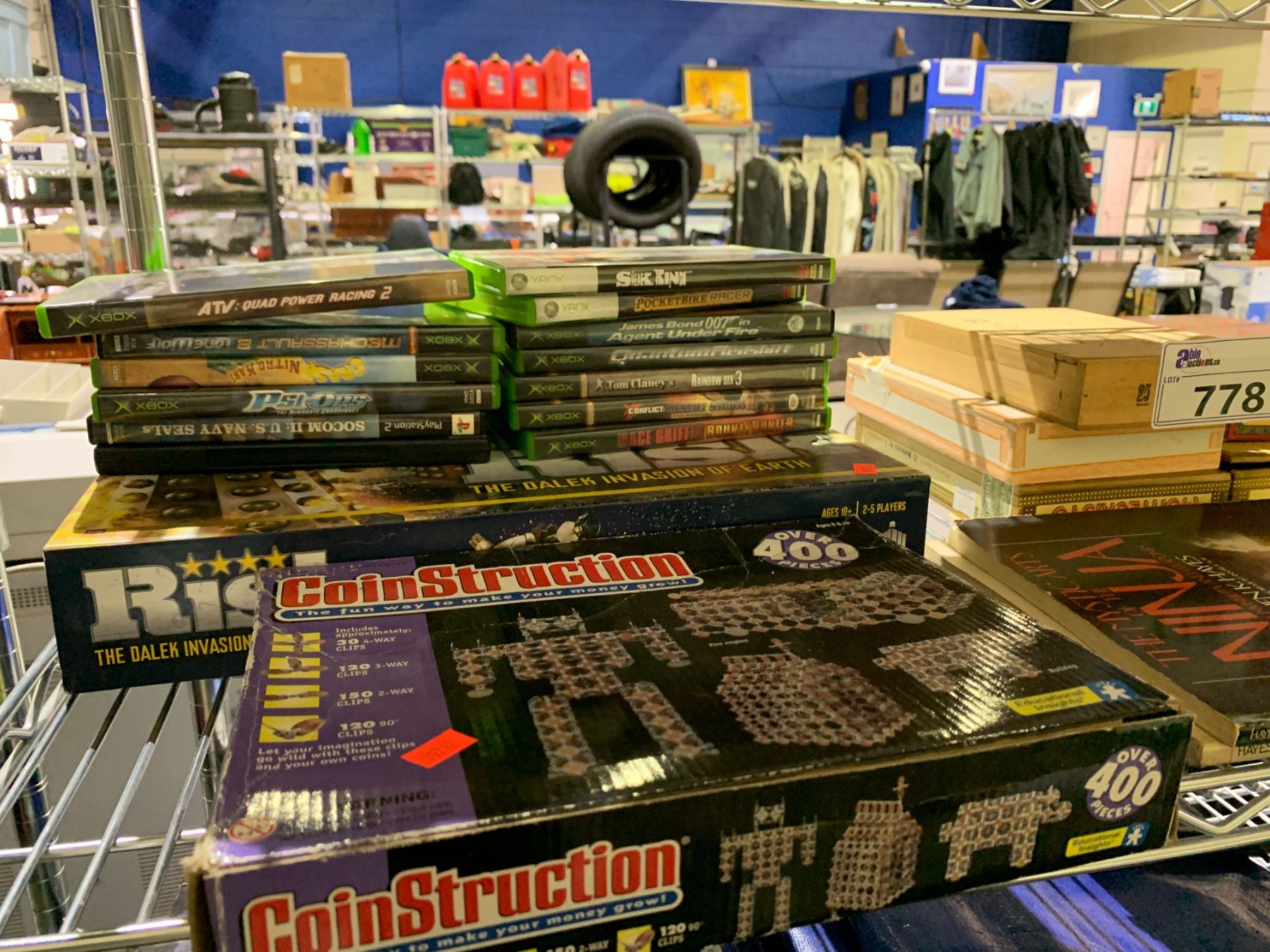 ASSORTED ITEMS INCLUDING; RISK, VIDEO GAMES, CIGAR BOXES & MORE