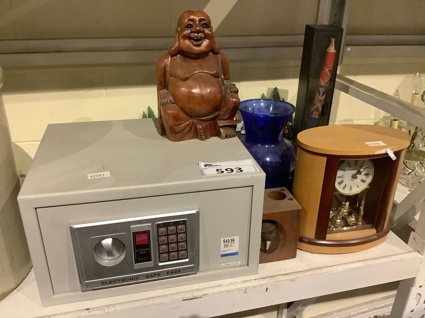 ASSORTED ITEMS INCLUDING; SAFE, CLOCK, BUDDHA & MORE