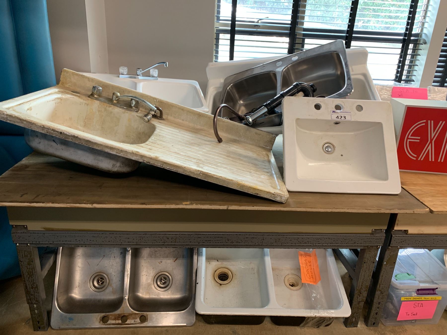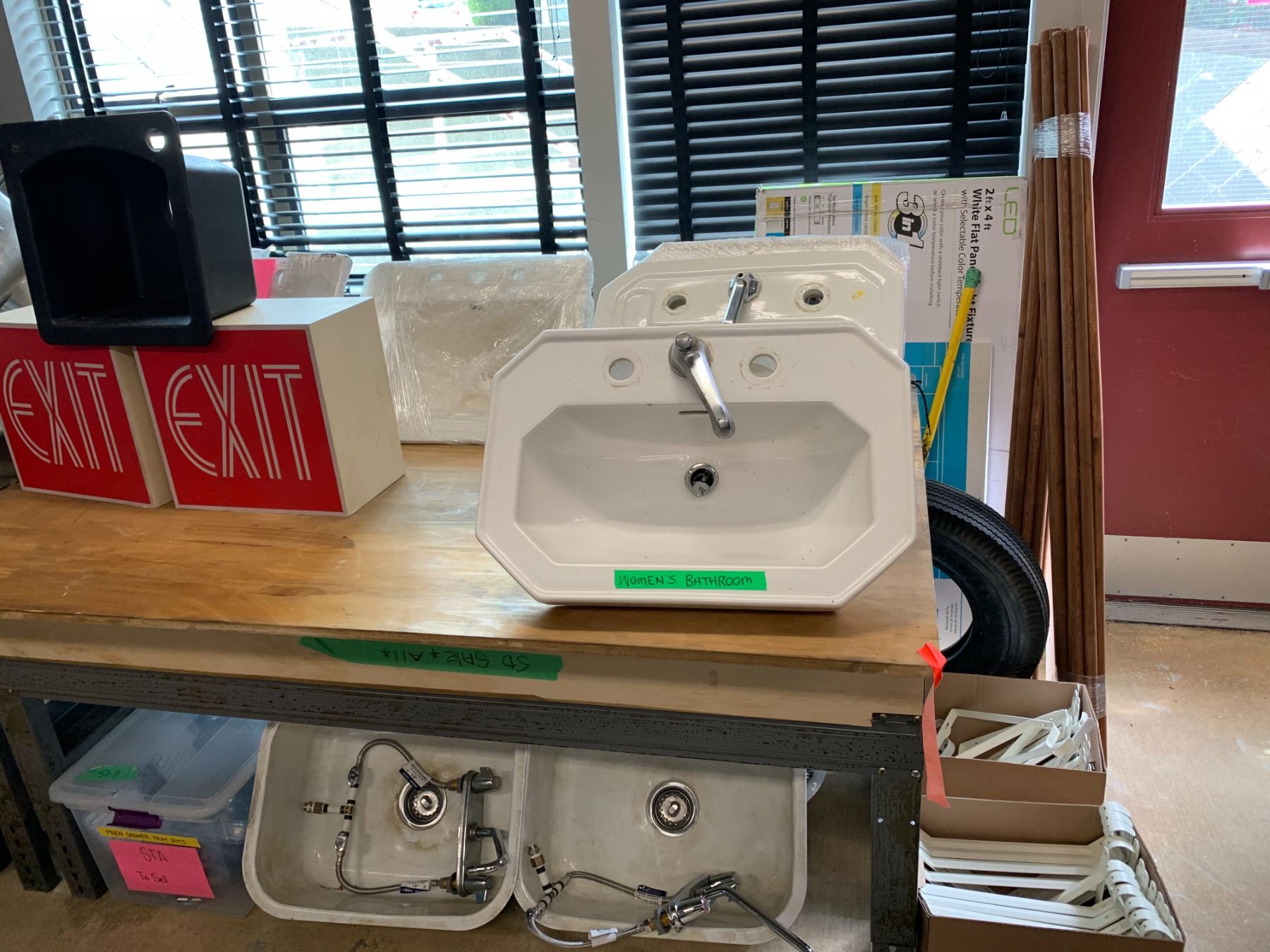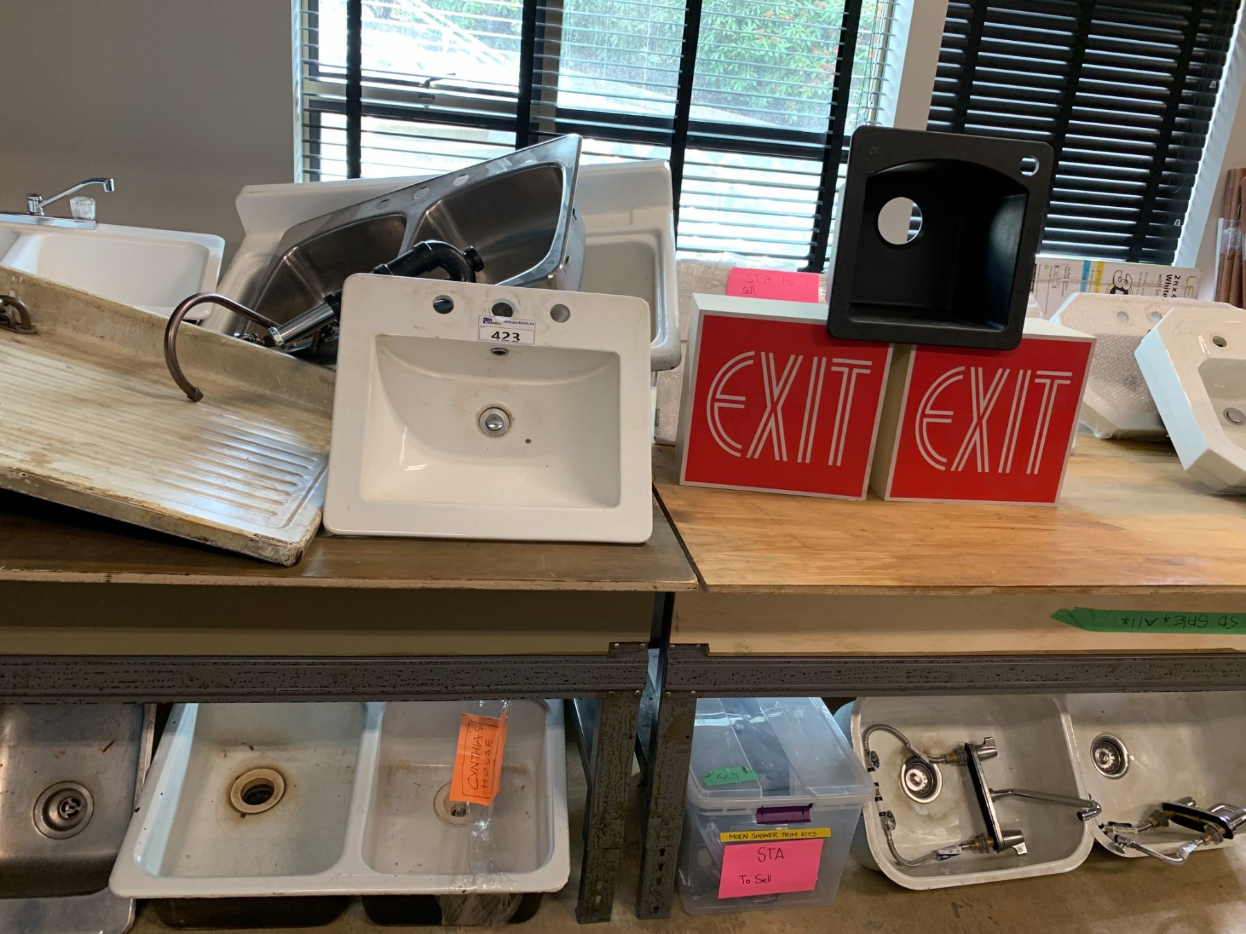 ASSORTED ITEMS INCLUDING; SINKS, TABLES, EXIT SIGNS & MORE (MUST TAKE ALL)