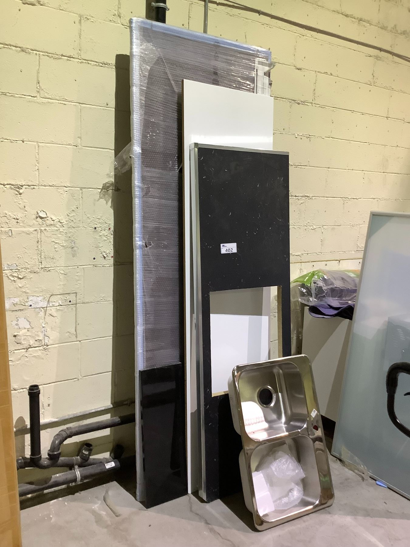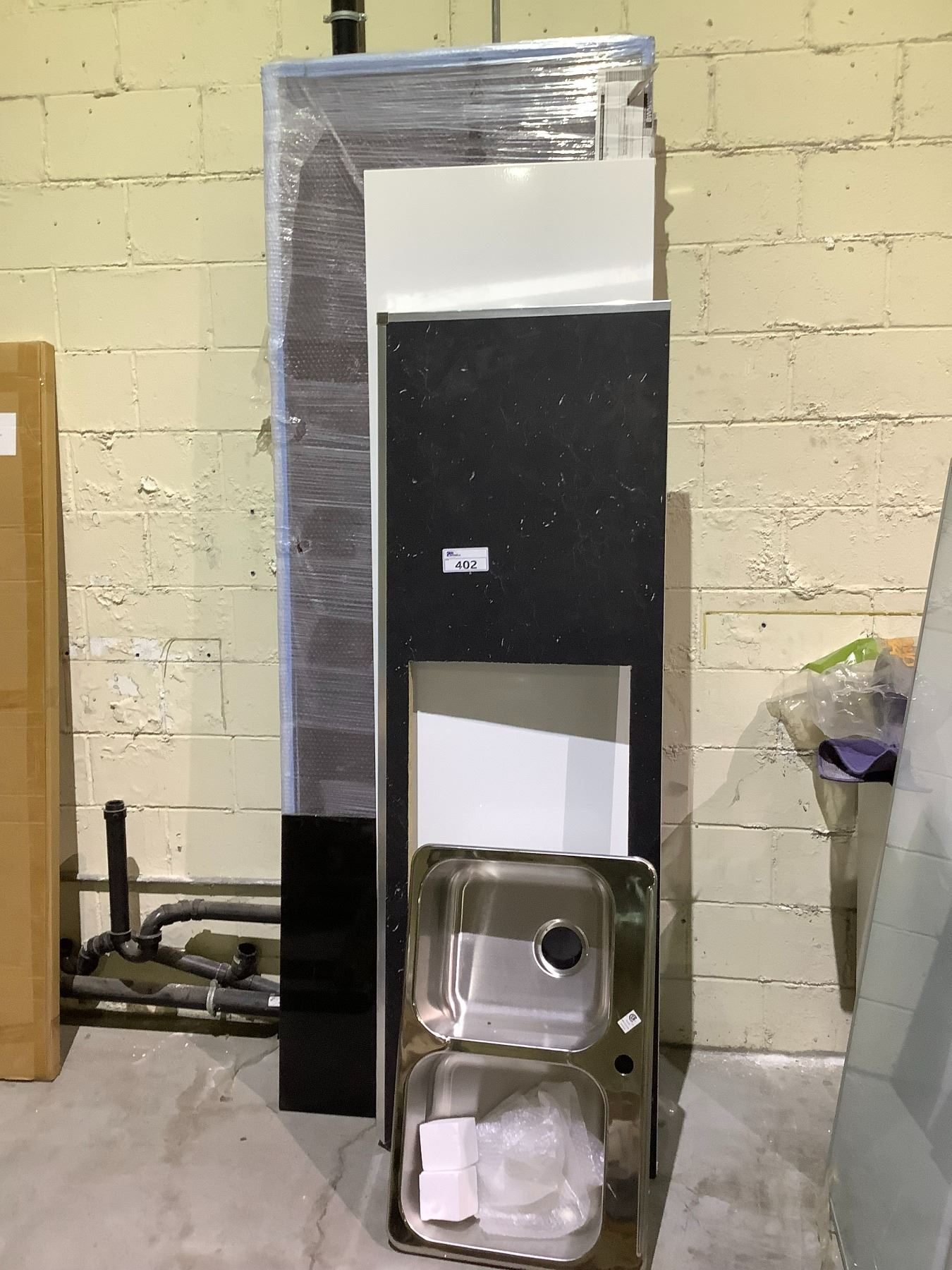 ASSORTED ITEMS INCLUDING: STAINLESS STEEL DOUBLE SINK, TABLETOP, COUNTERTOP AND MORE