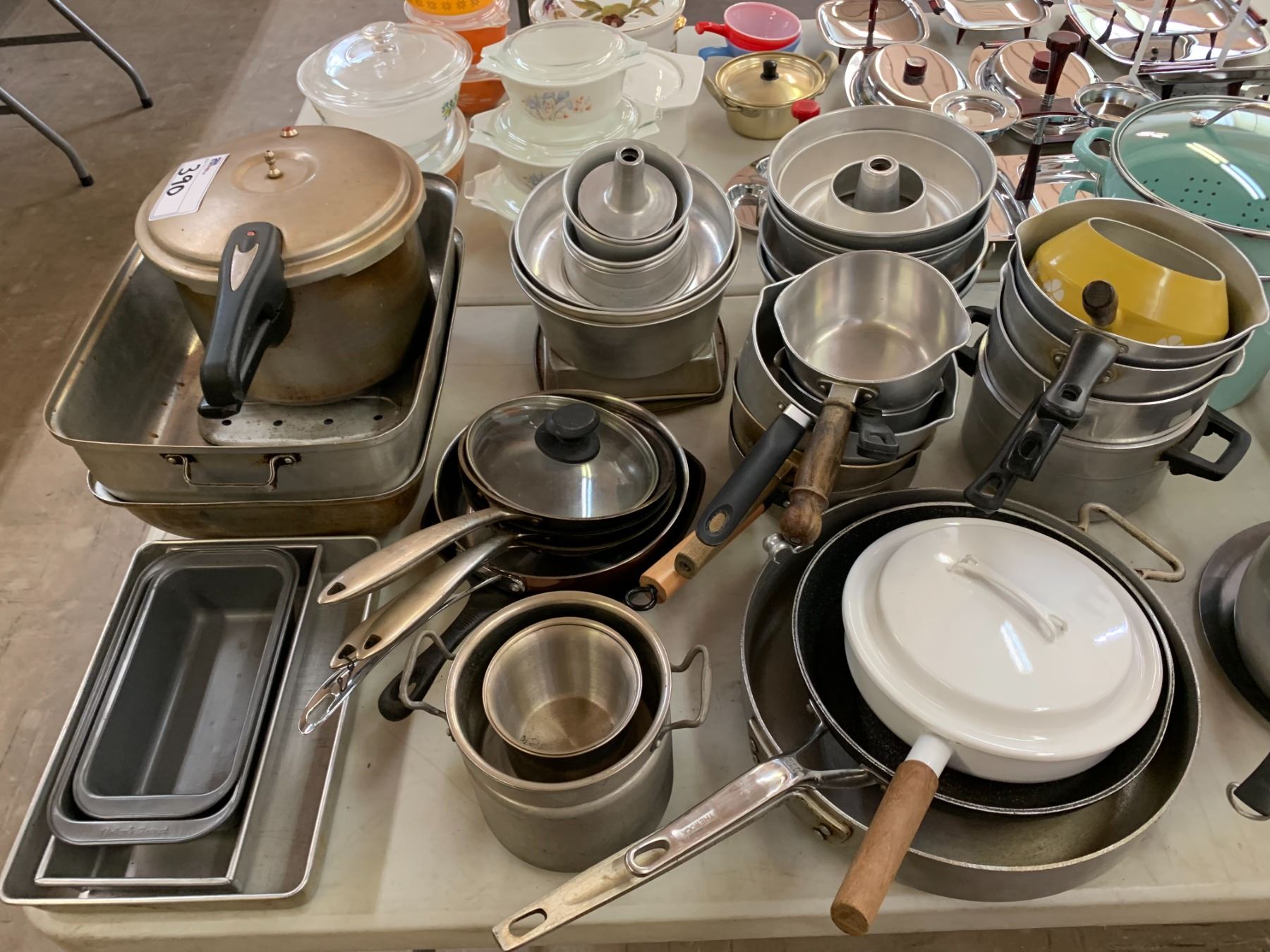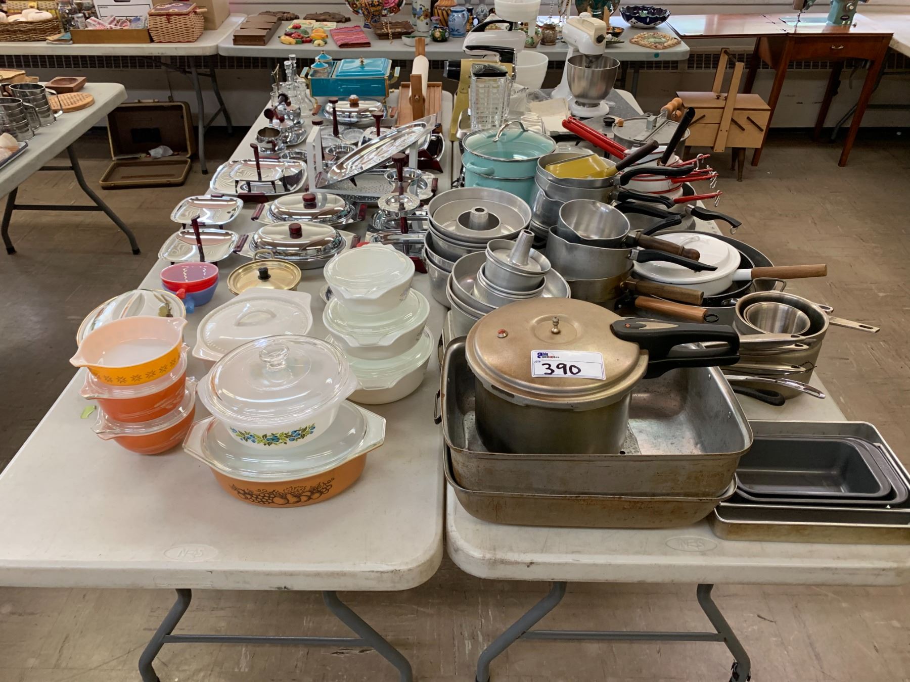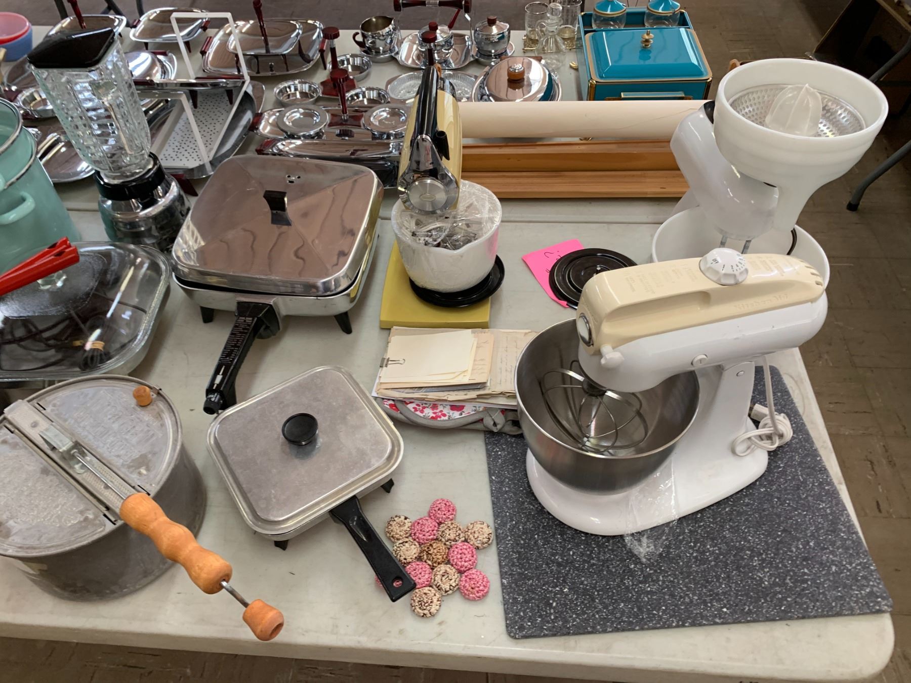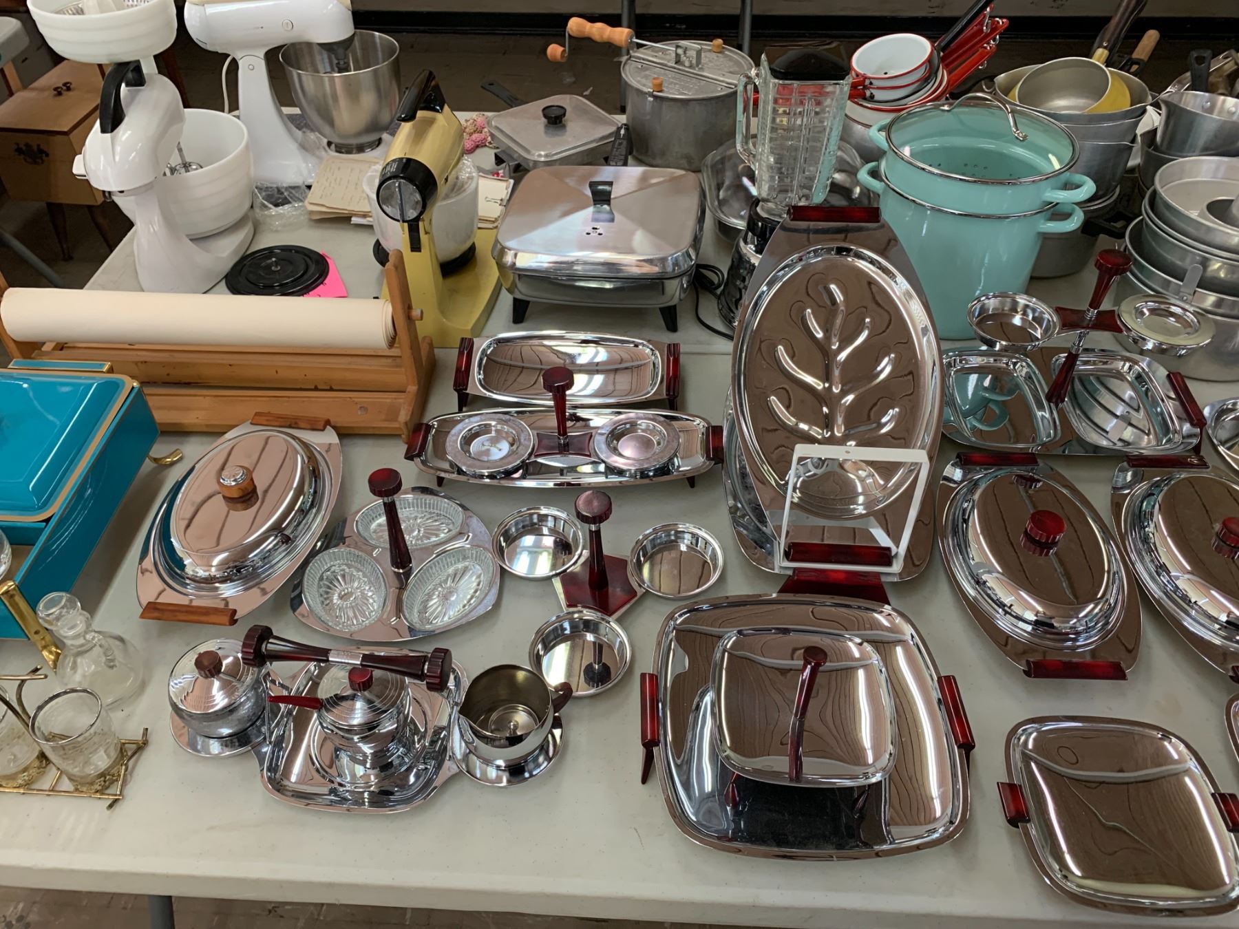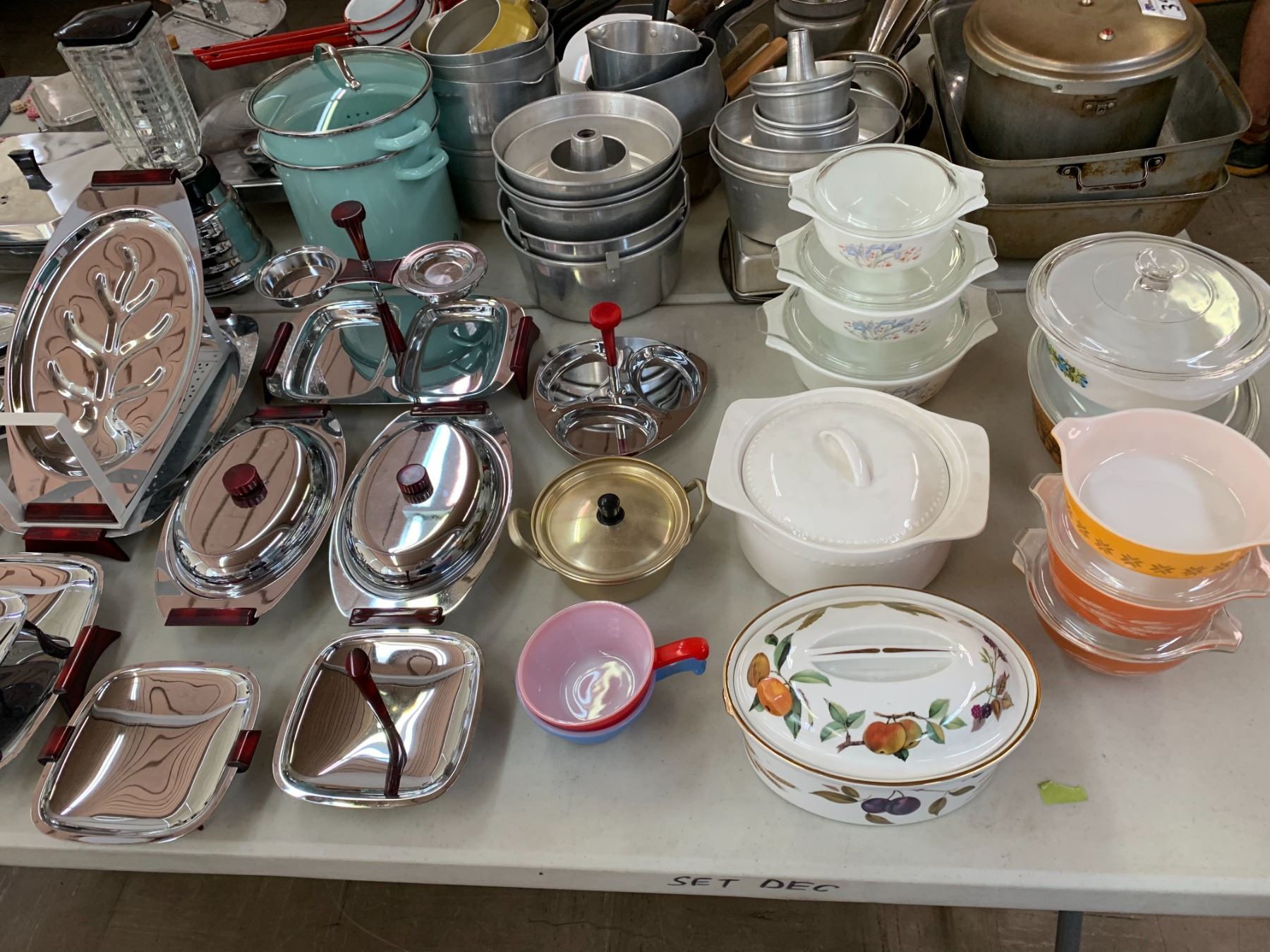 ASSORTED ITEMS INCLUDING; STAND MIXERS, POTS & PANS, CASSEROLE DISHES, SERVING DISHES & MORE (TABLES NOT INCLUDED)