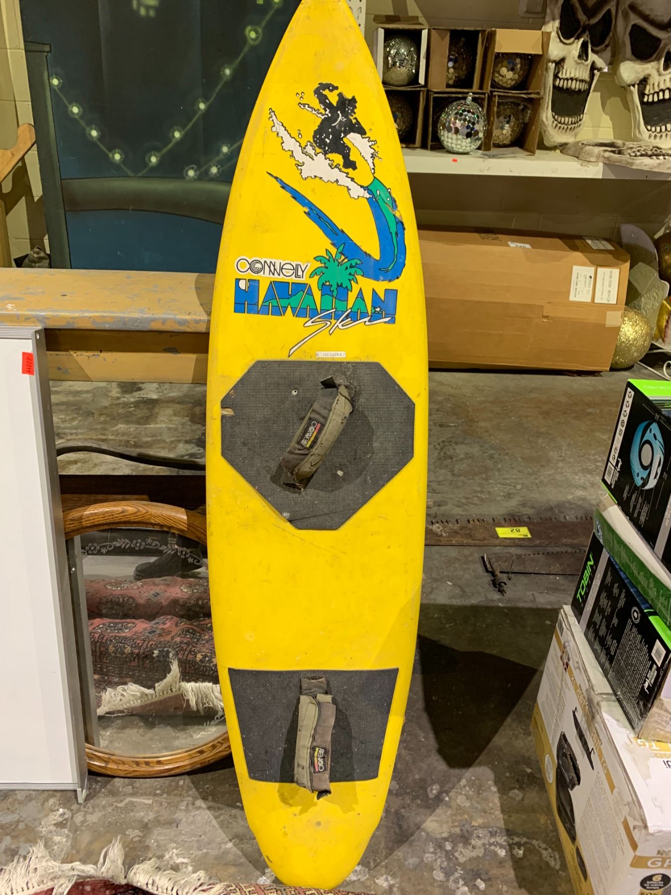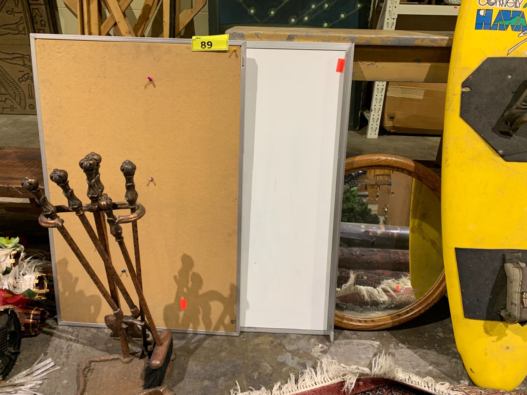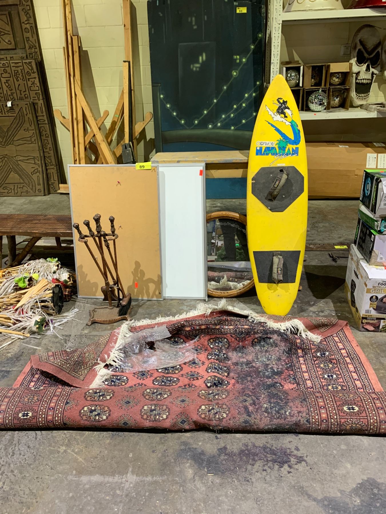 ASSORTED ITEMS INCLUDING; SURF BOARD PROP. AREA RUG, CORK BOARD & MORE