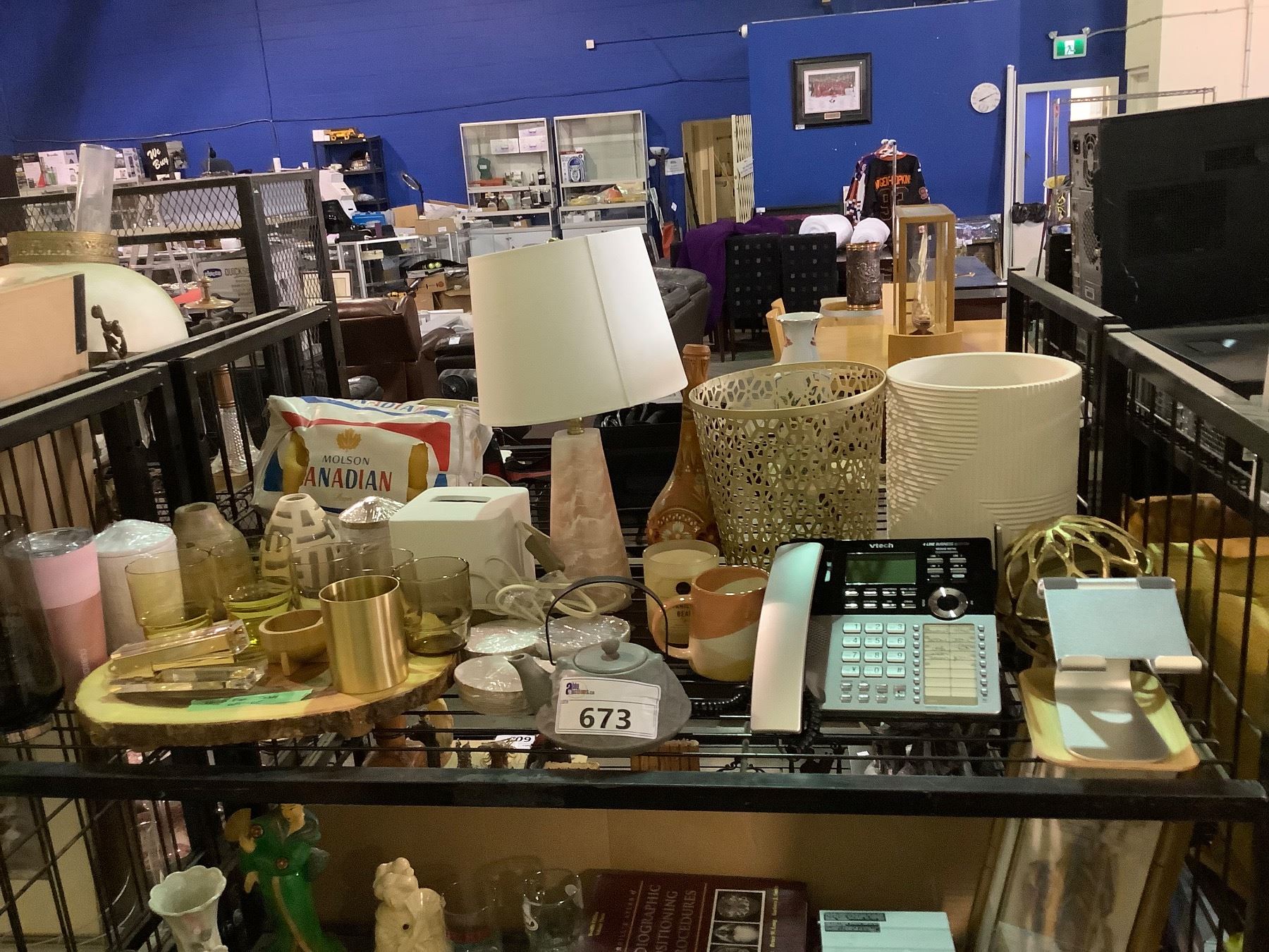 ASSORTED ITEMS INCLUDING; TABLE LAMP, GLASSWARE, WASTE PAPER BASKET & MORE