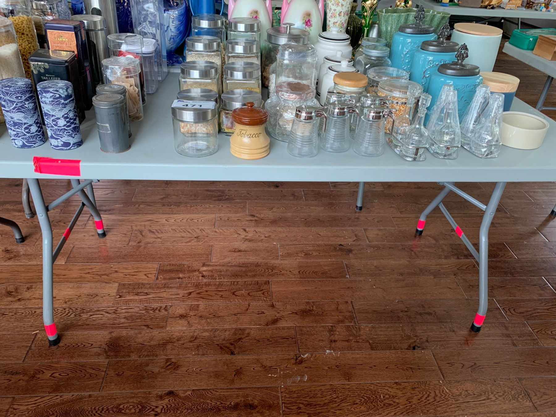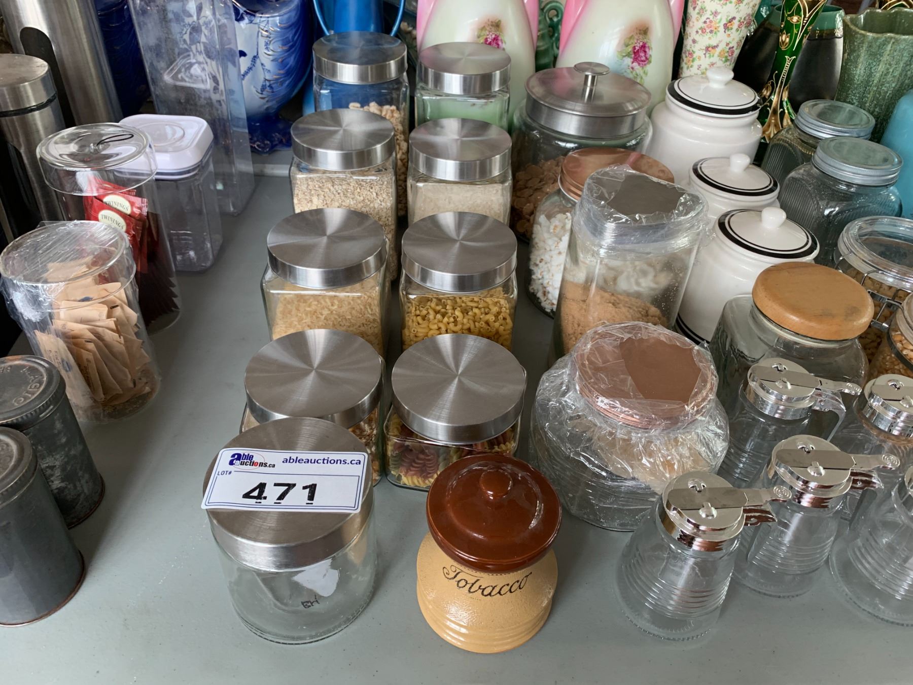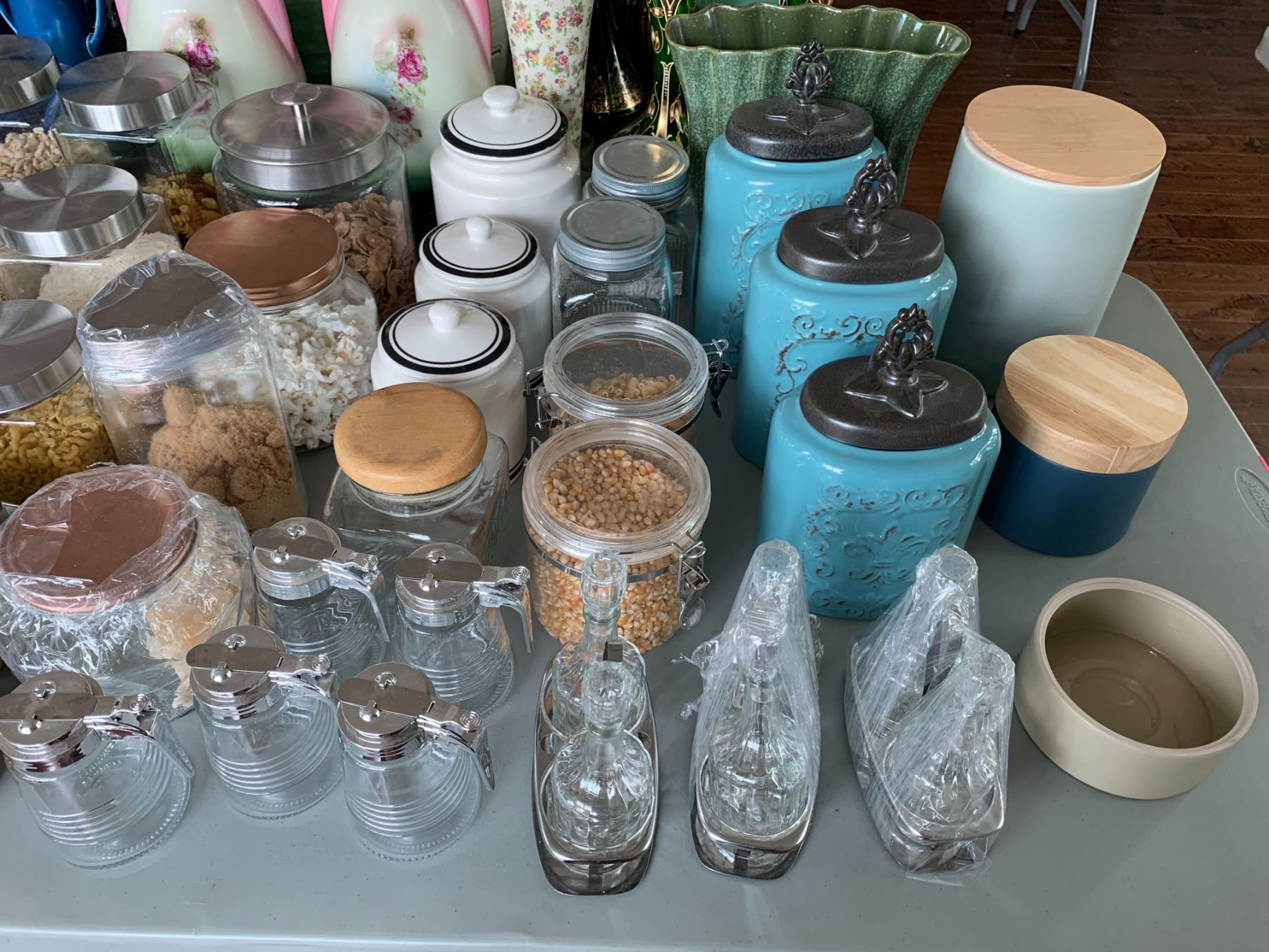 ASSORTED ITEMS INCLUDING; TEA BAGS, PANTRY CONTAINERS WITH ASSORTED CONTENTS, SYRUP POURERS & MORE (TABLE NOT INCLUDED)