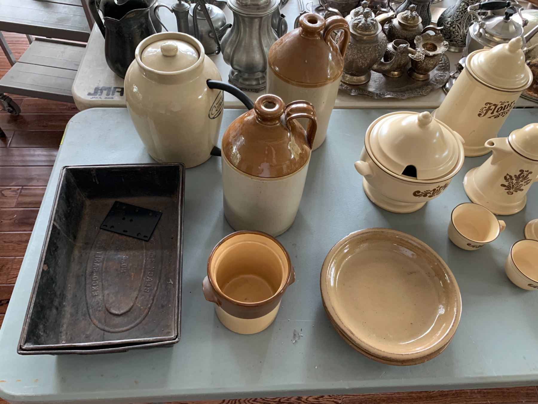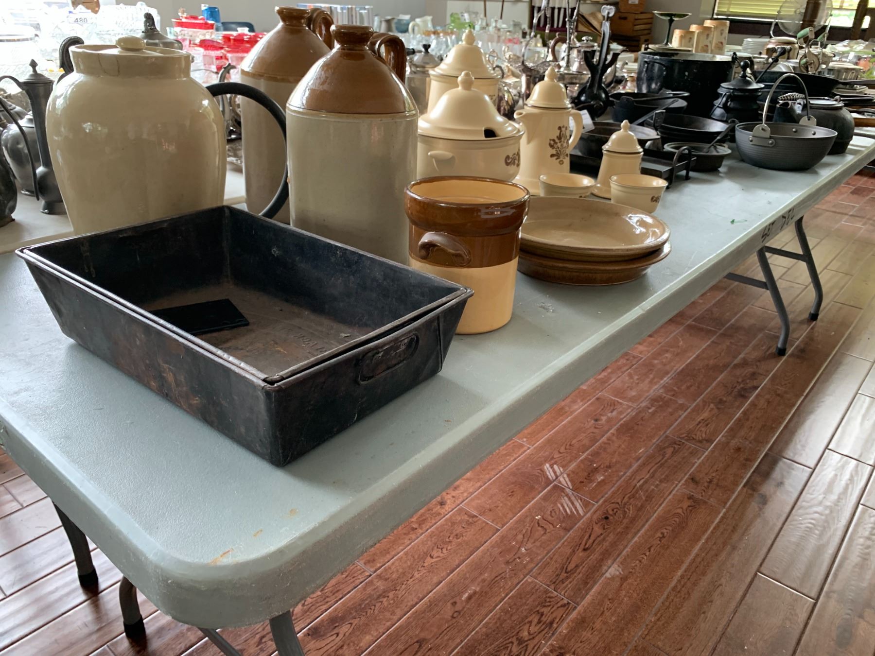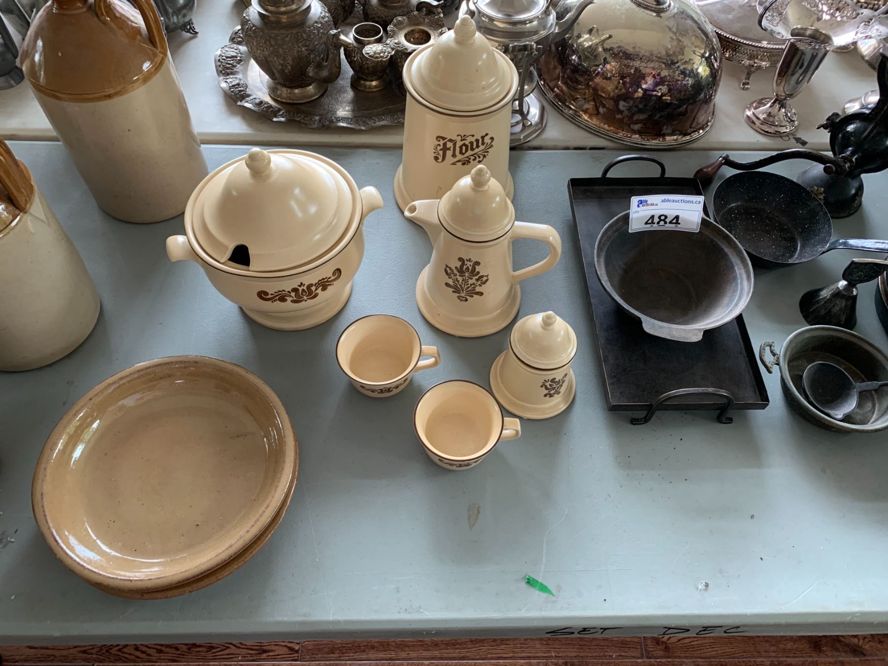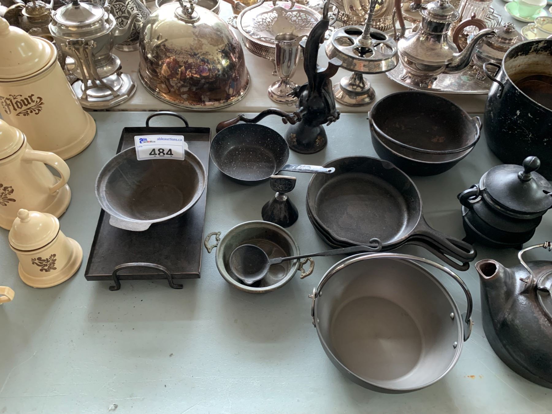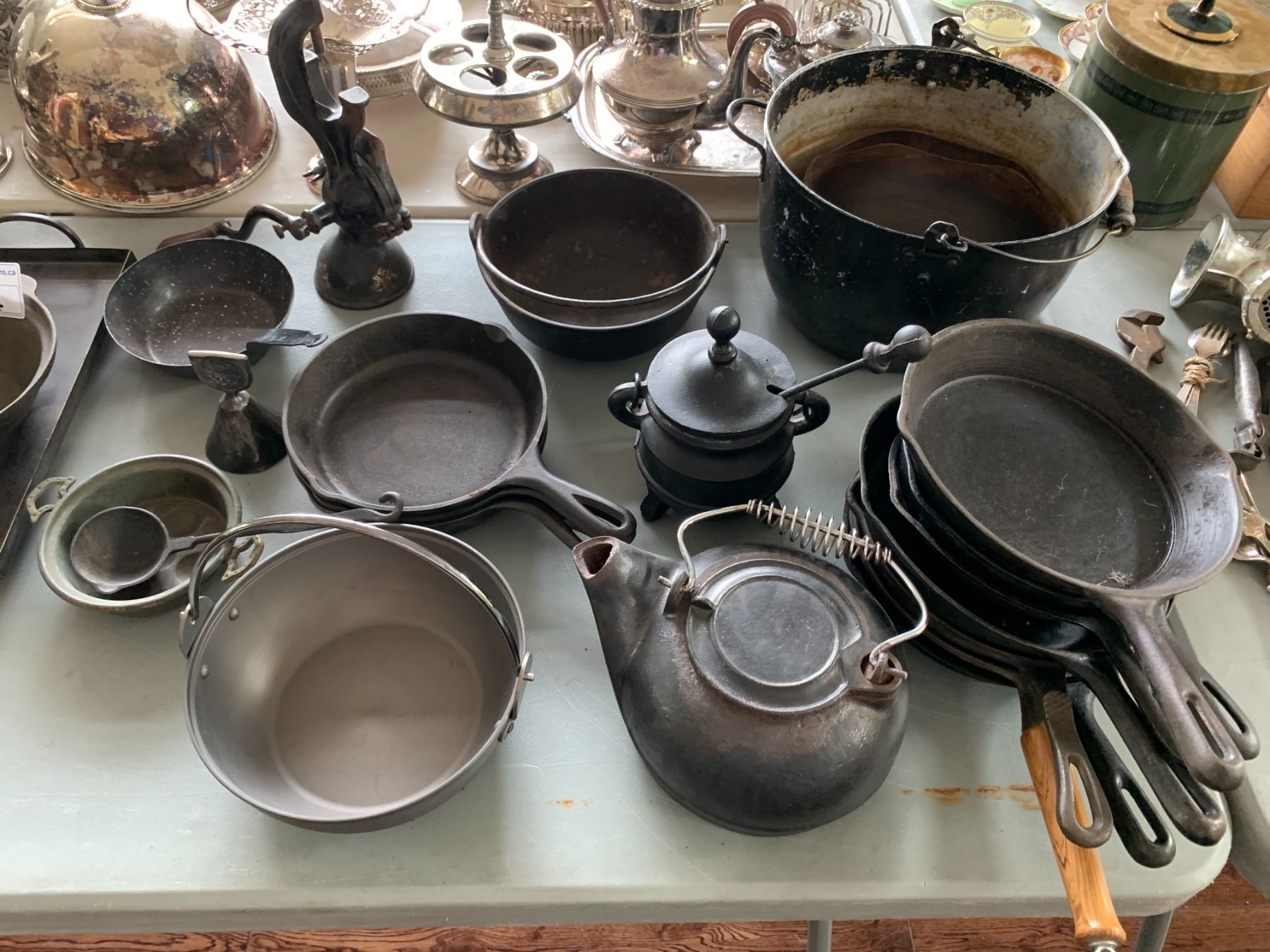 ASSORTED ITEMS INCLUDING; TEA SET, CAST IRON PANS, CAST IRON POTS & MORE (TABLE NOT INCLUDED)