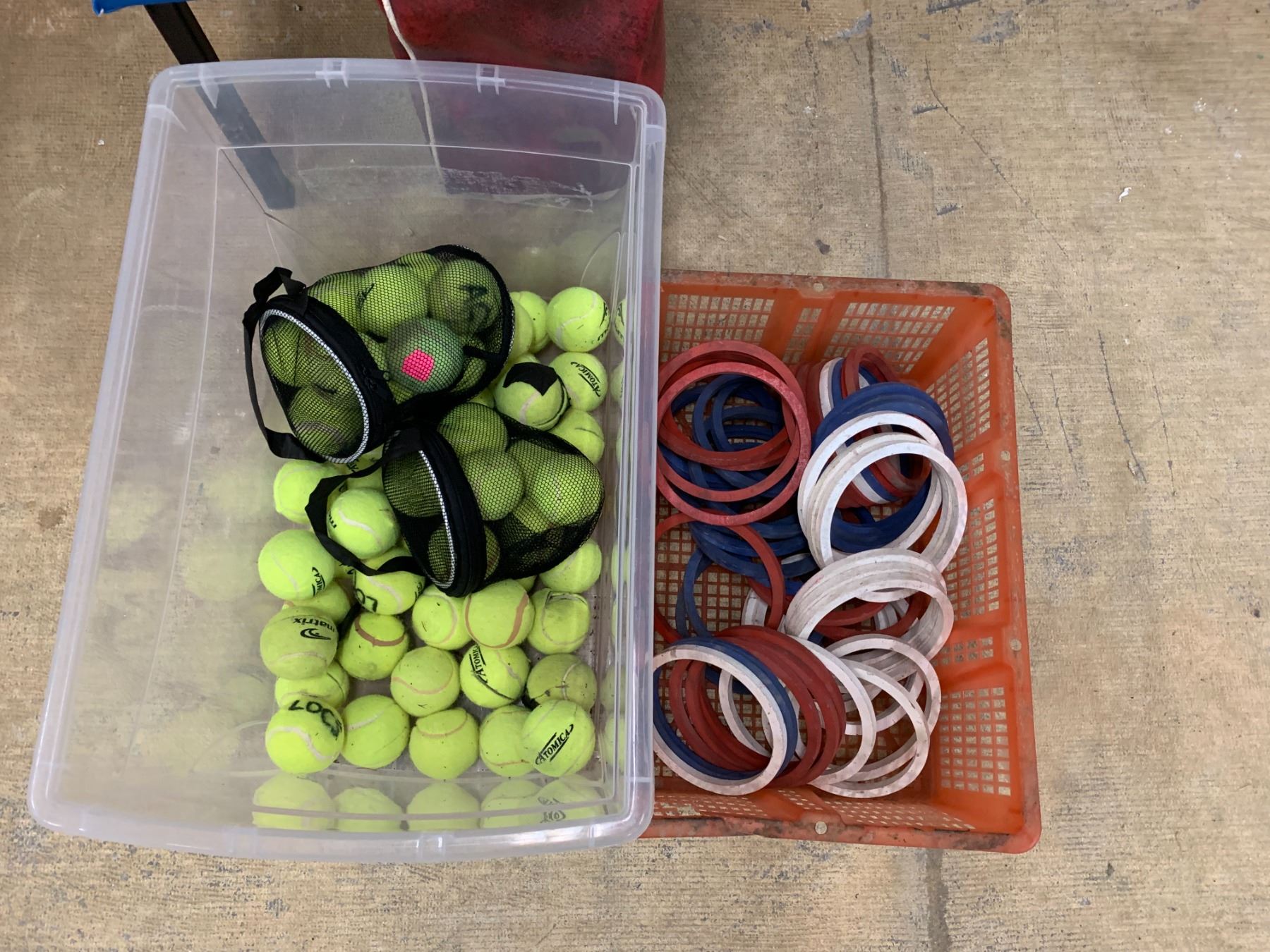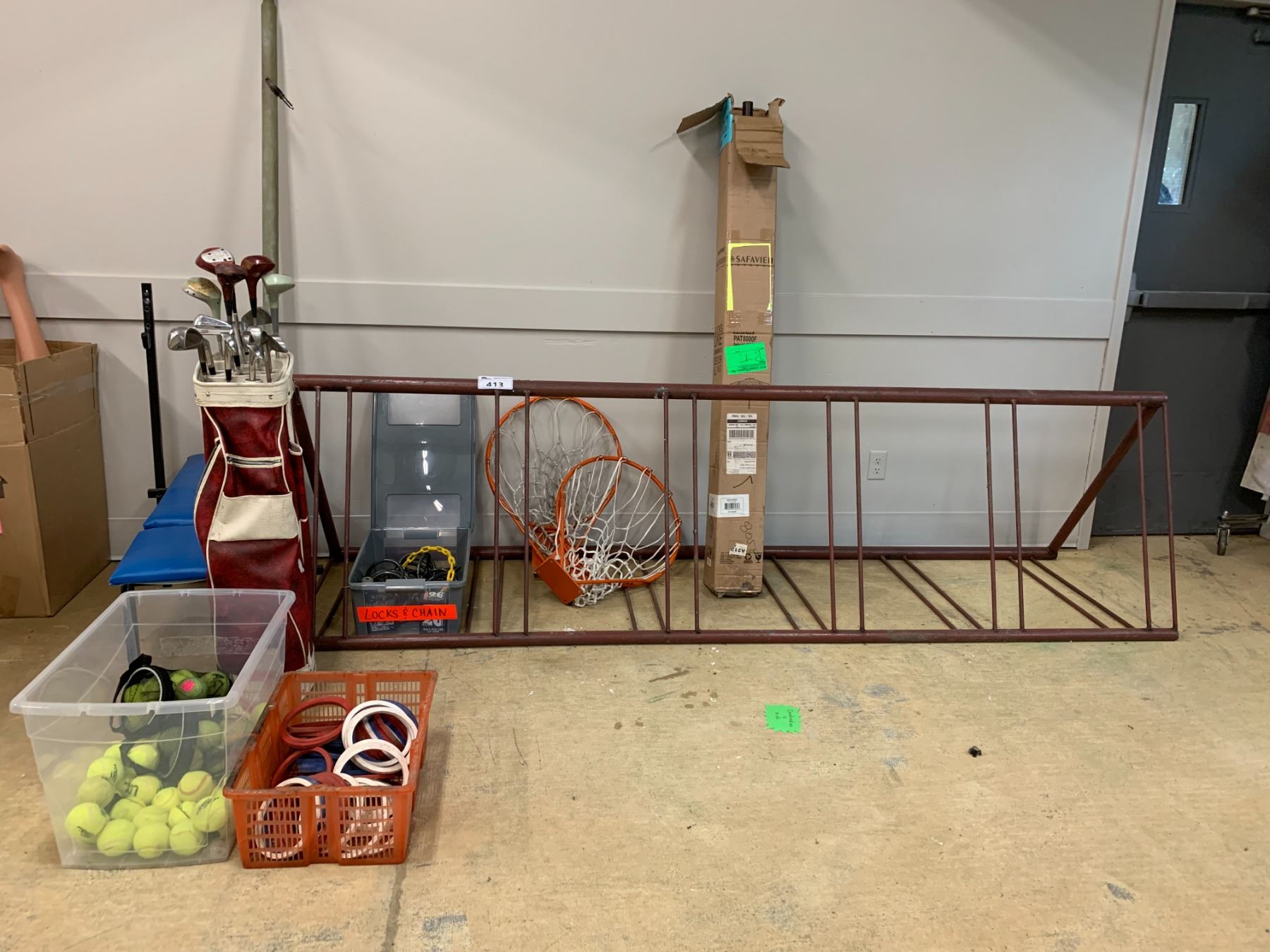 ASSORTED ITEMS INCLUDING; TENNIS BALLS, GOLF CLUBS, WEIGHT BENCH, BASKETBALL HOOPS, BICYCLE RACK & MORE BICYCLE RACK & MORE