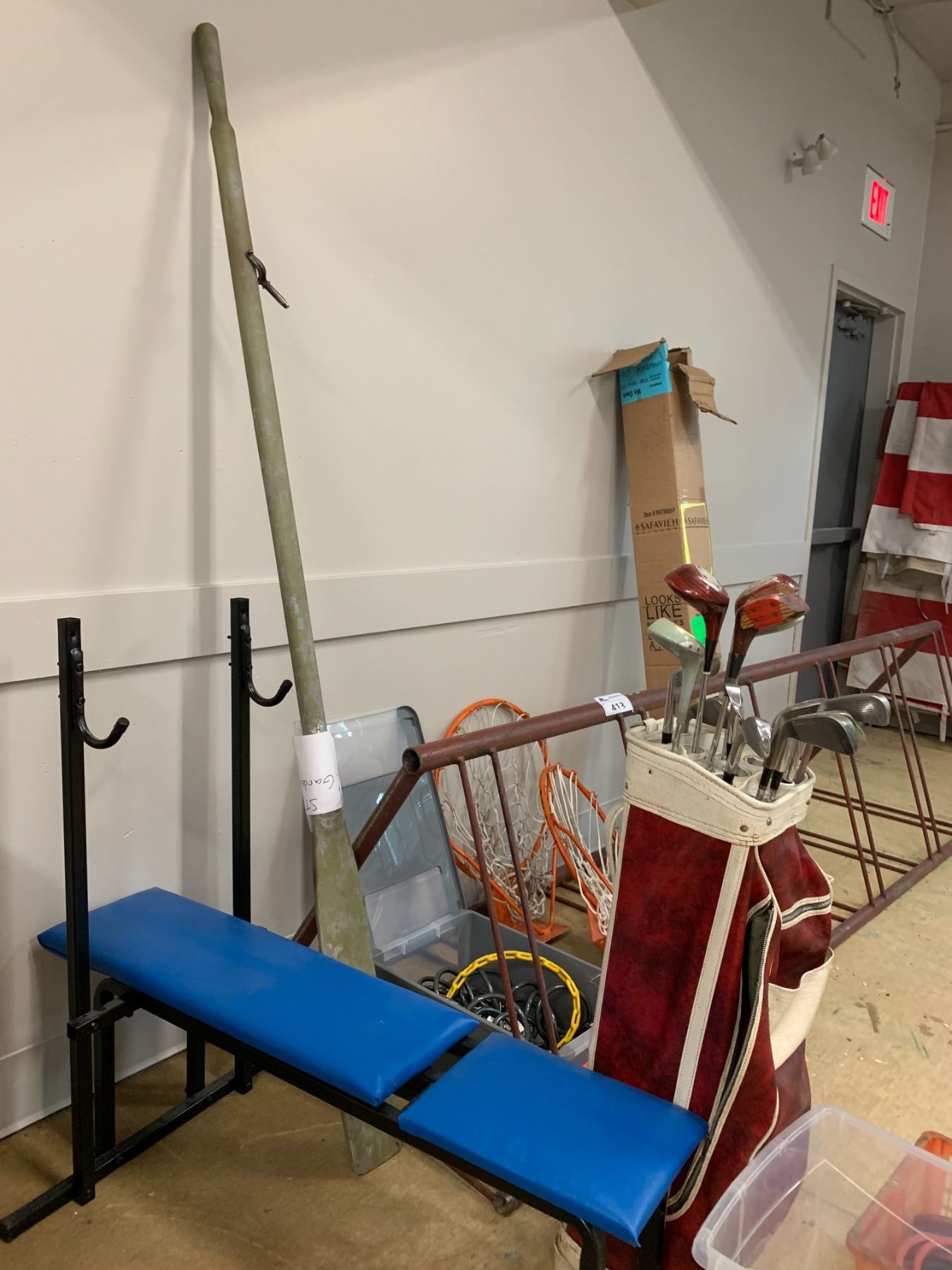 ASSORTED ITEMS INCLUDING; TENNIS BALLS, GOLF CLUBS, WEIGHT BENCH, BASKETBALL HOOPS, BICYCLE RACK ...