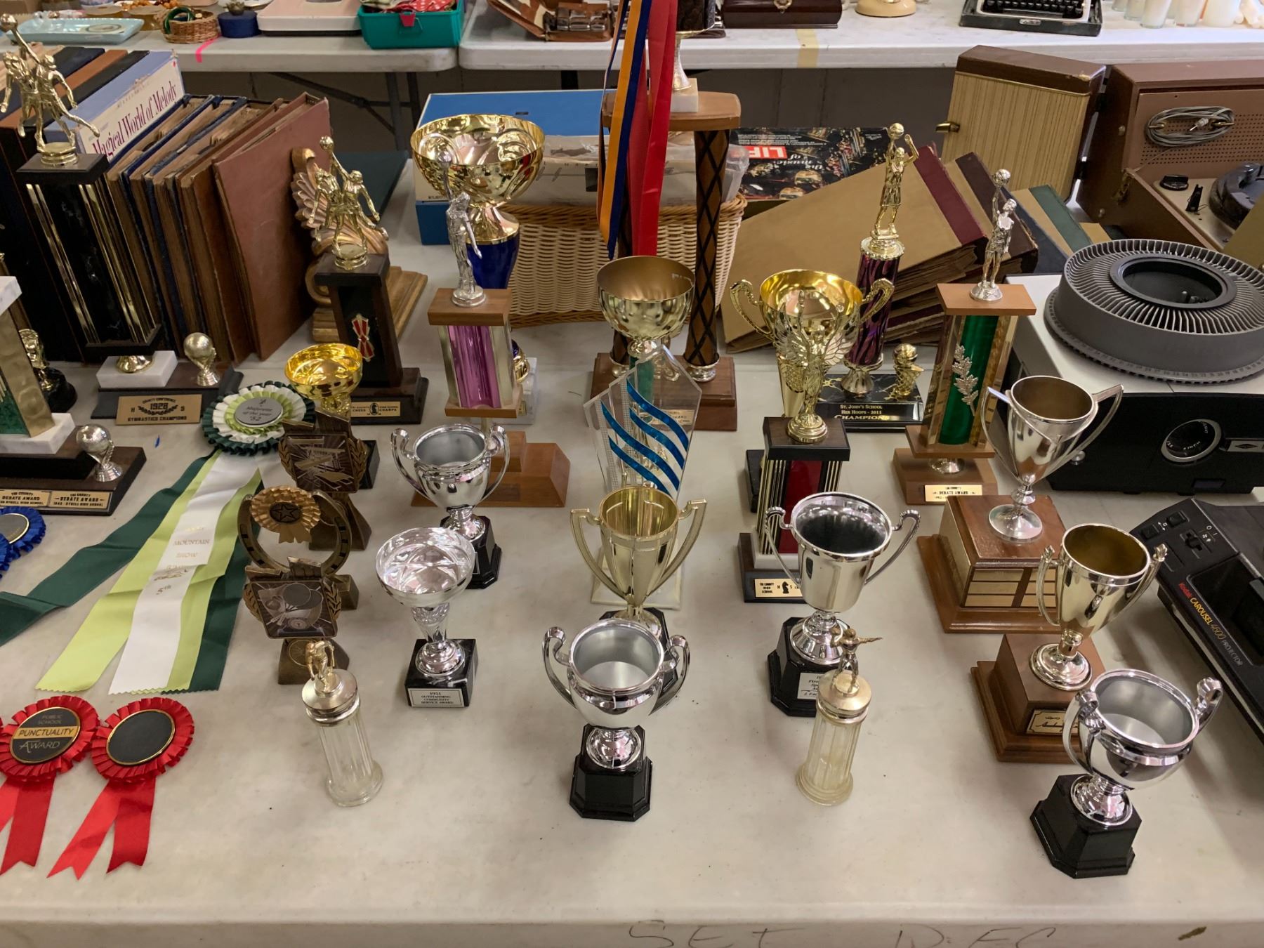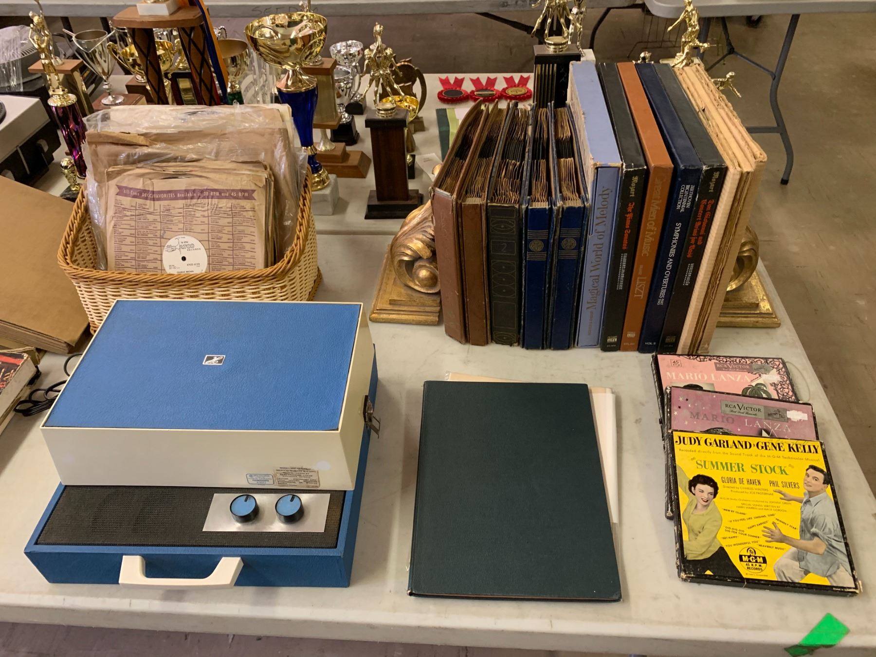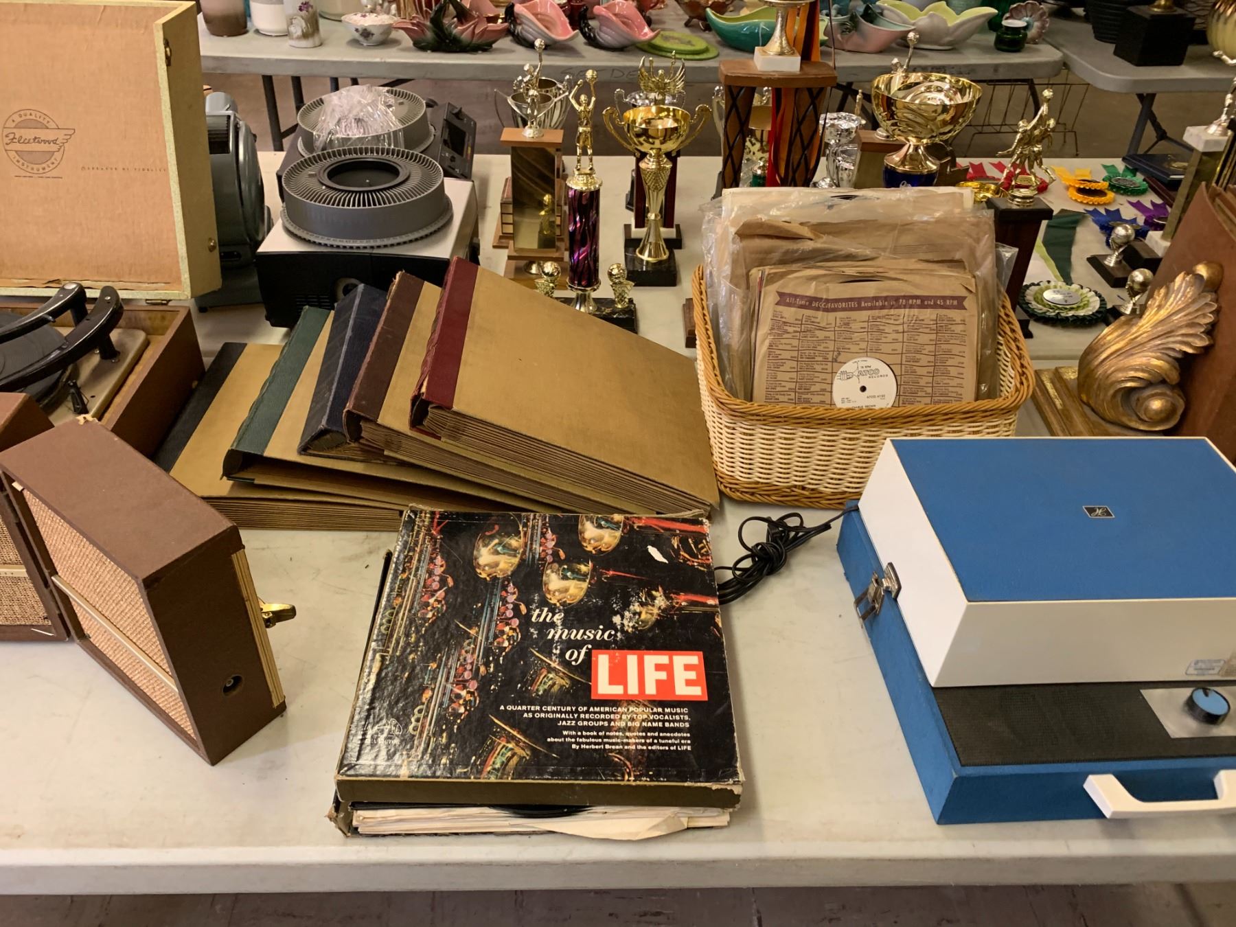 ASSORTED ITEMS INCLUDING; TROPHIES, FLEETWOOD RECORD PLAYER, ELECTROHOME RECORD PLAYER, VINYL RECORDS, SLIDE PROJECTORS & MORE (TABLES NOT INCLUDED)