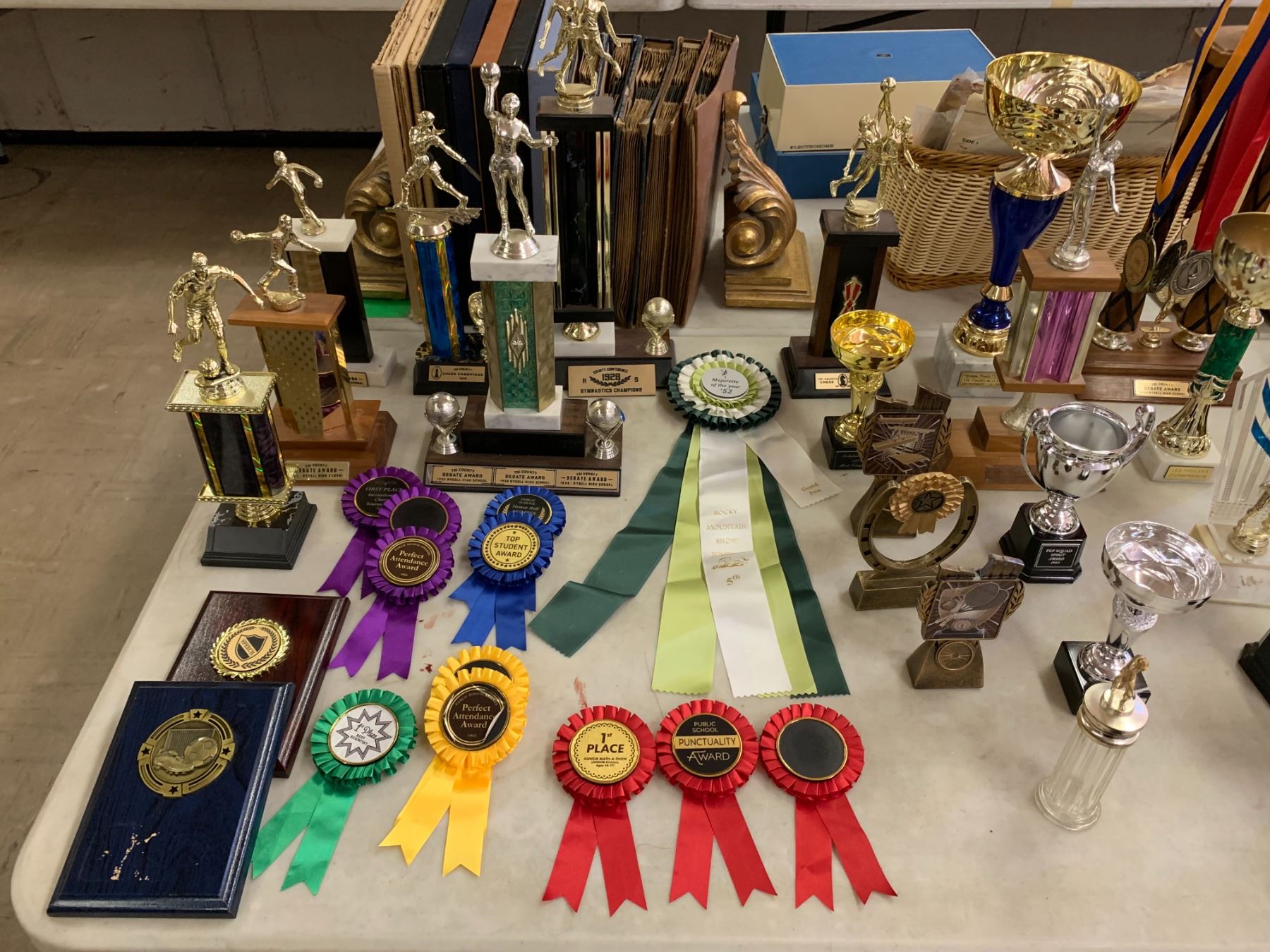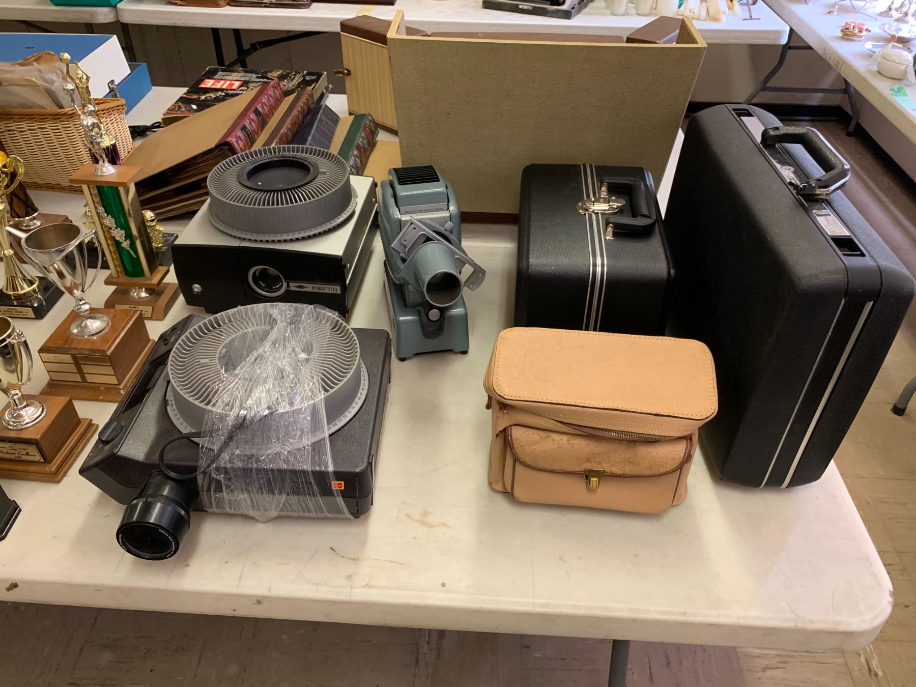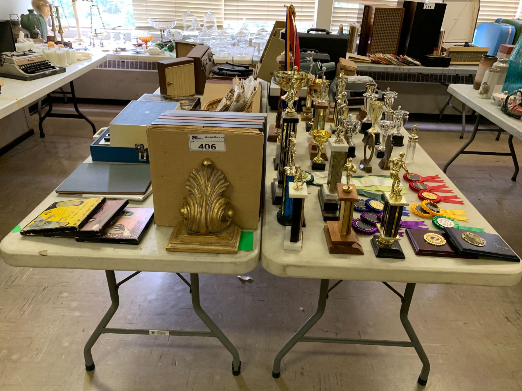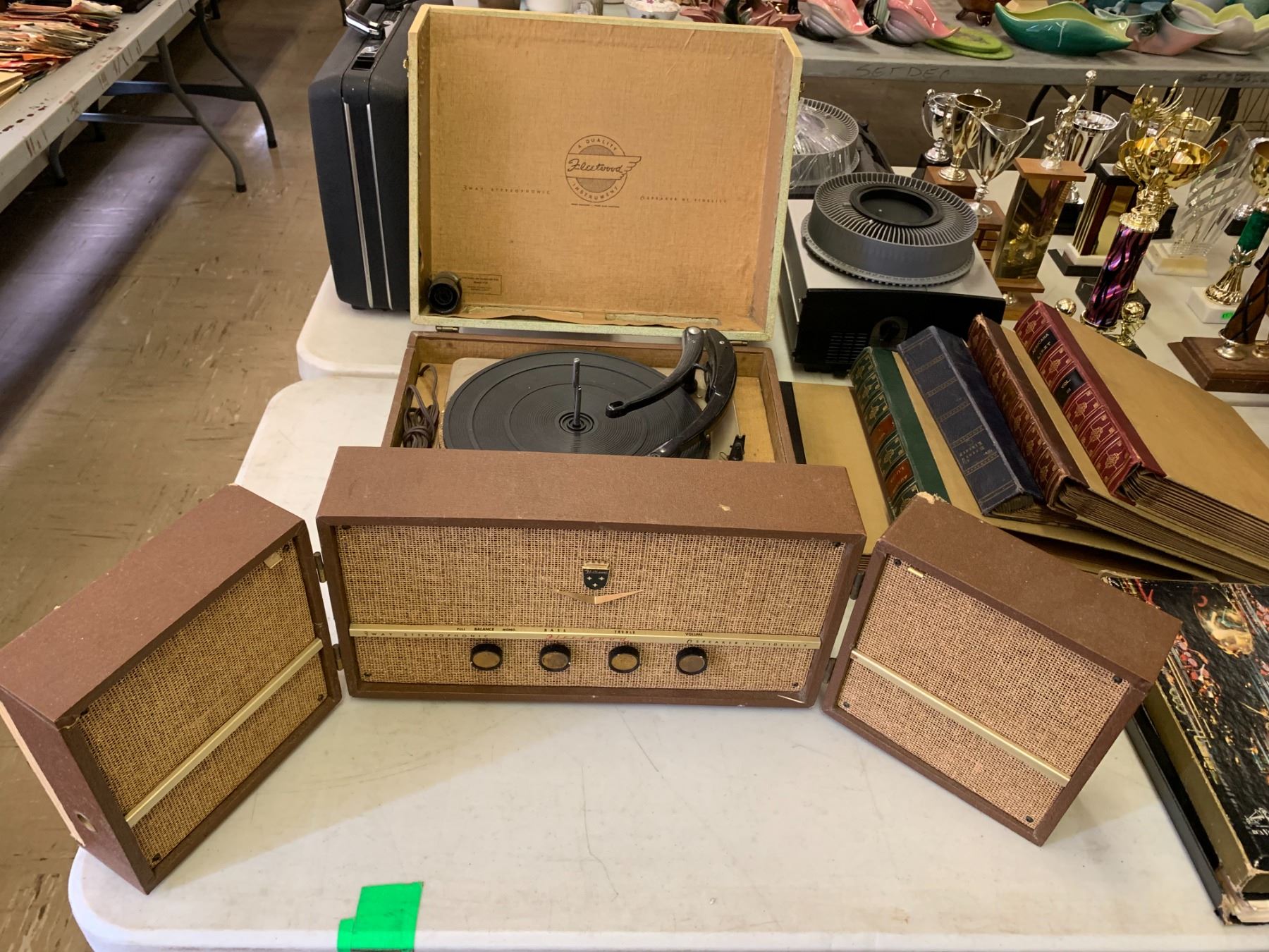 ASSORTED ITEMS INCLUDING; TROPHIES, FLEETWOOD RECORD PLAYER, ELECTROHOME RECORD PLAYER, VINYL RECORDS, SLIDE PROJECTORS & MORE (TABLES NOT INCLUDED)