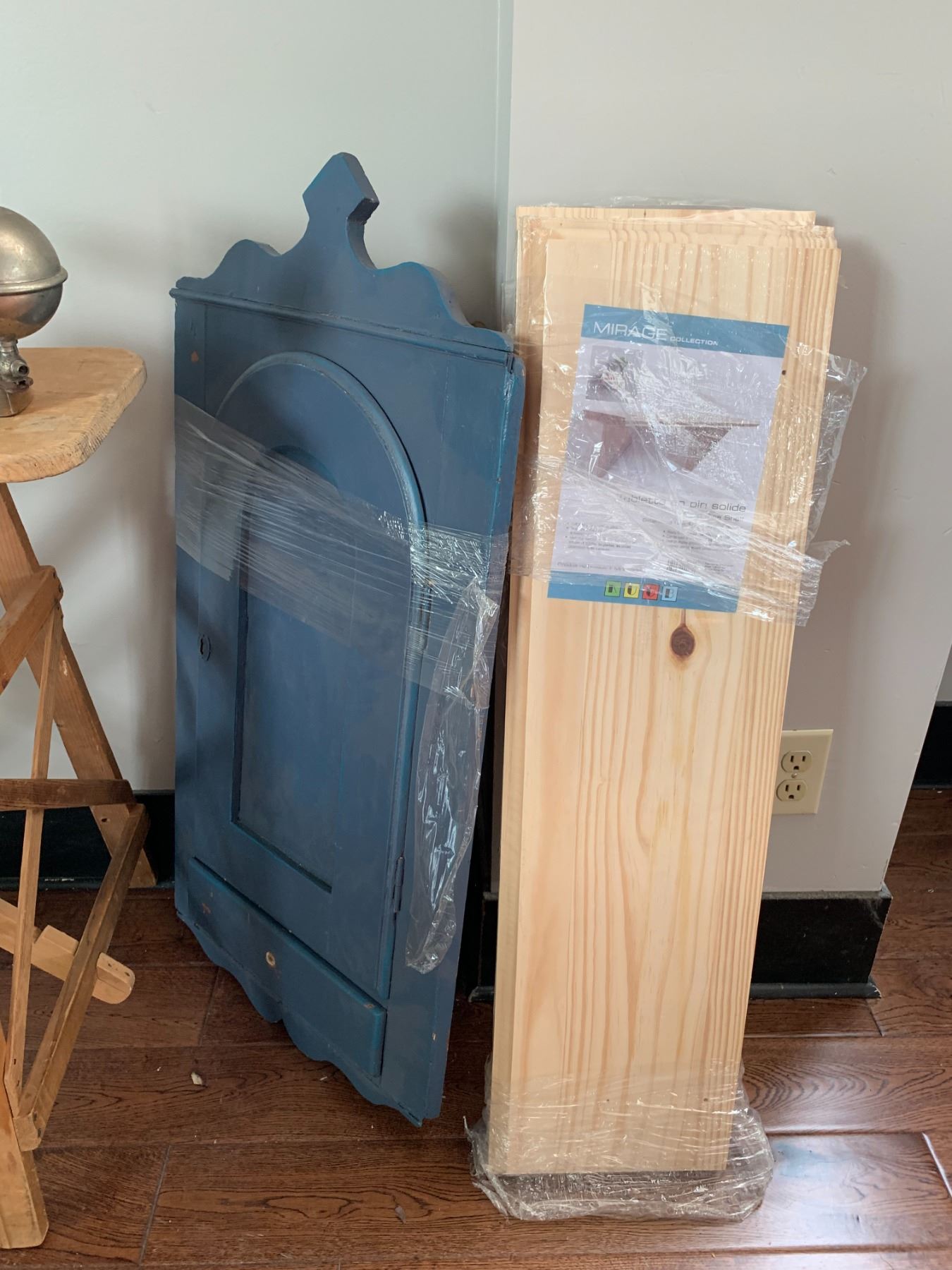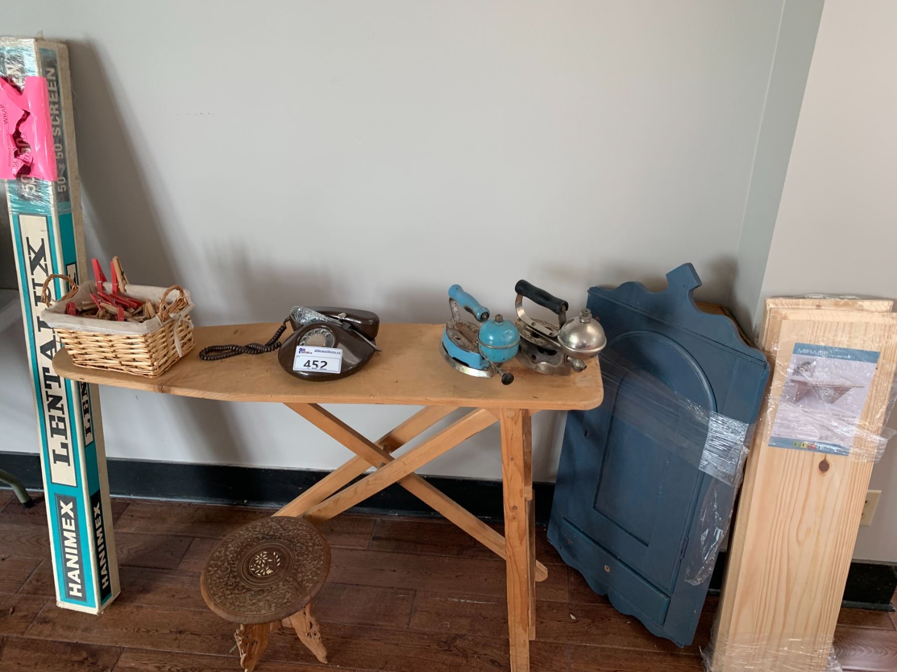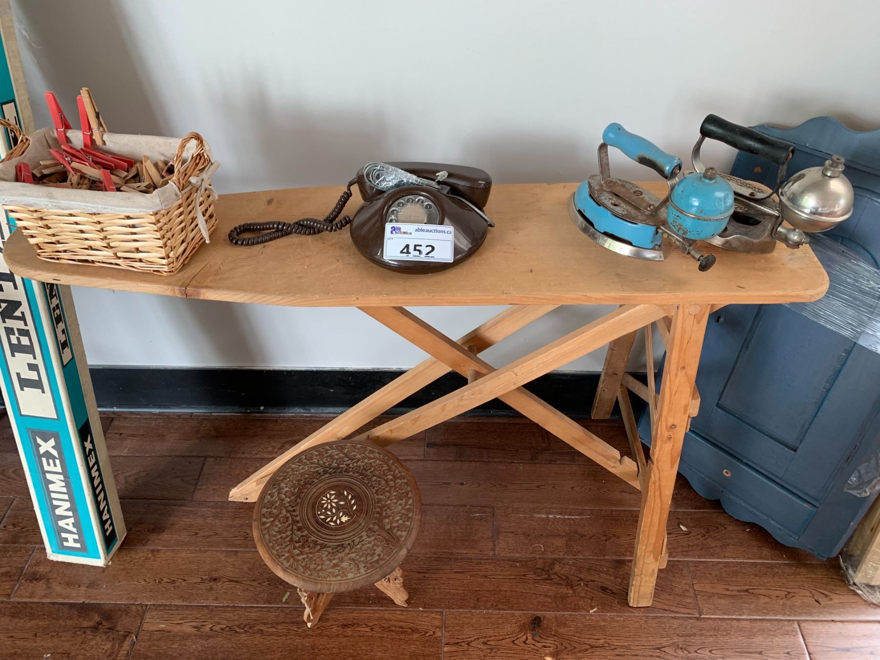 ASSORTED ITEMS INCLUDING; WOOD IRONING BOARD, VINTAGE TELEPHONE, VINTAGE IRONS, CORNER CABINET & MORE