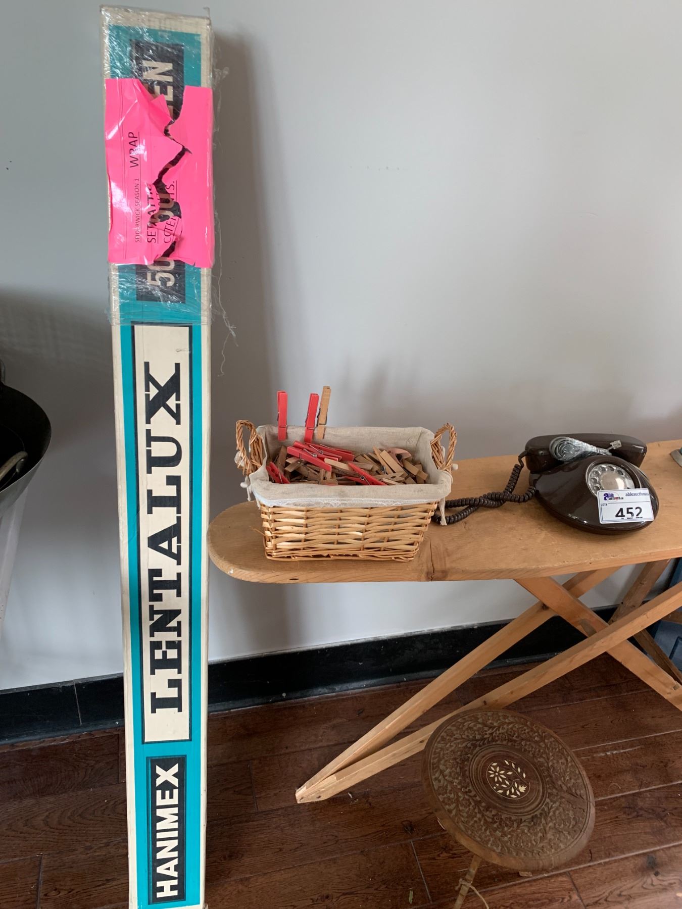 ASSORTED ITEMS INCLUDING; WOOD IRONING BOARD, VINTAGE TELEPHONE, VINTAGE IRONS, CORNER CABINET & ...