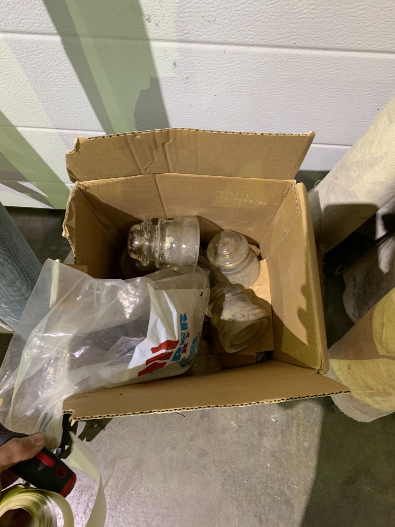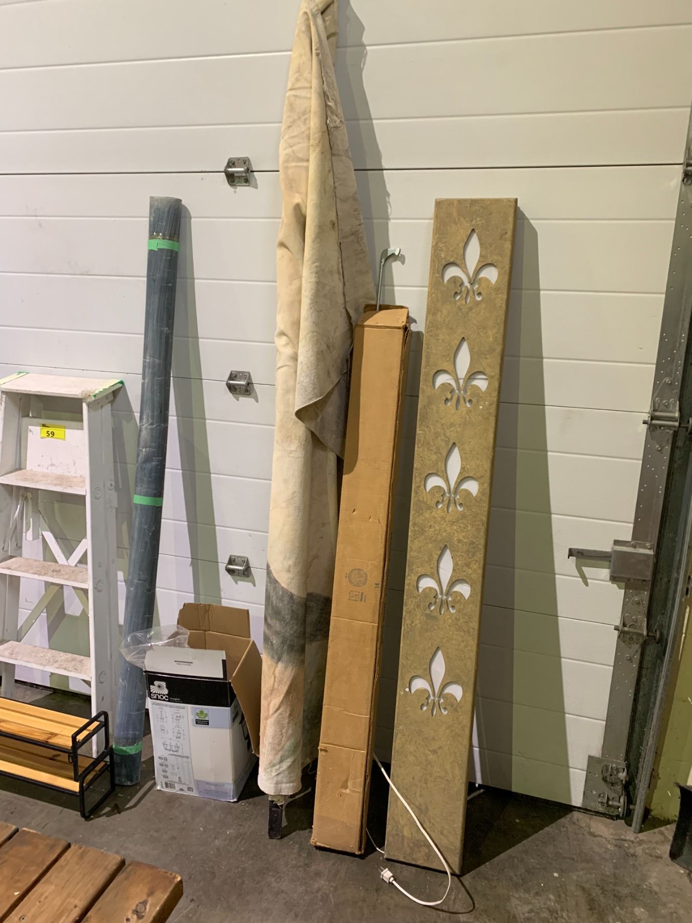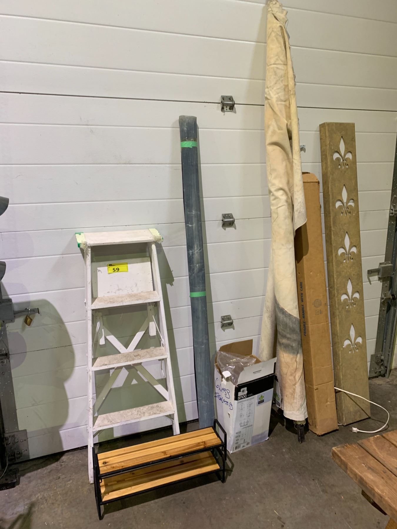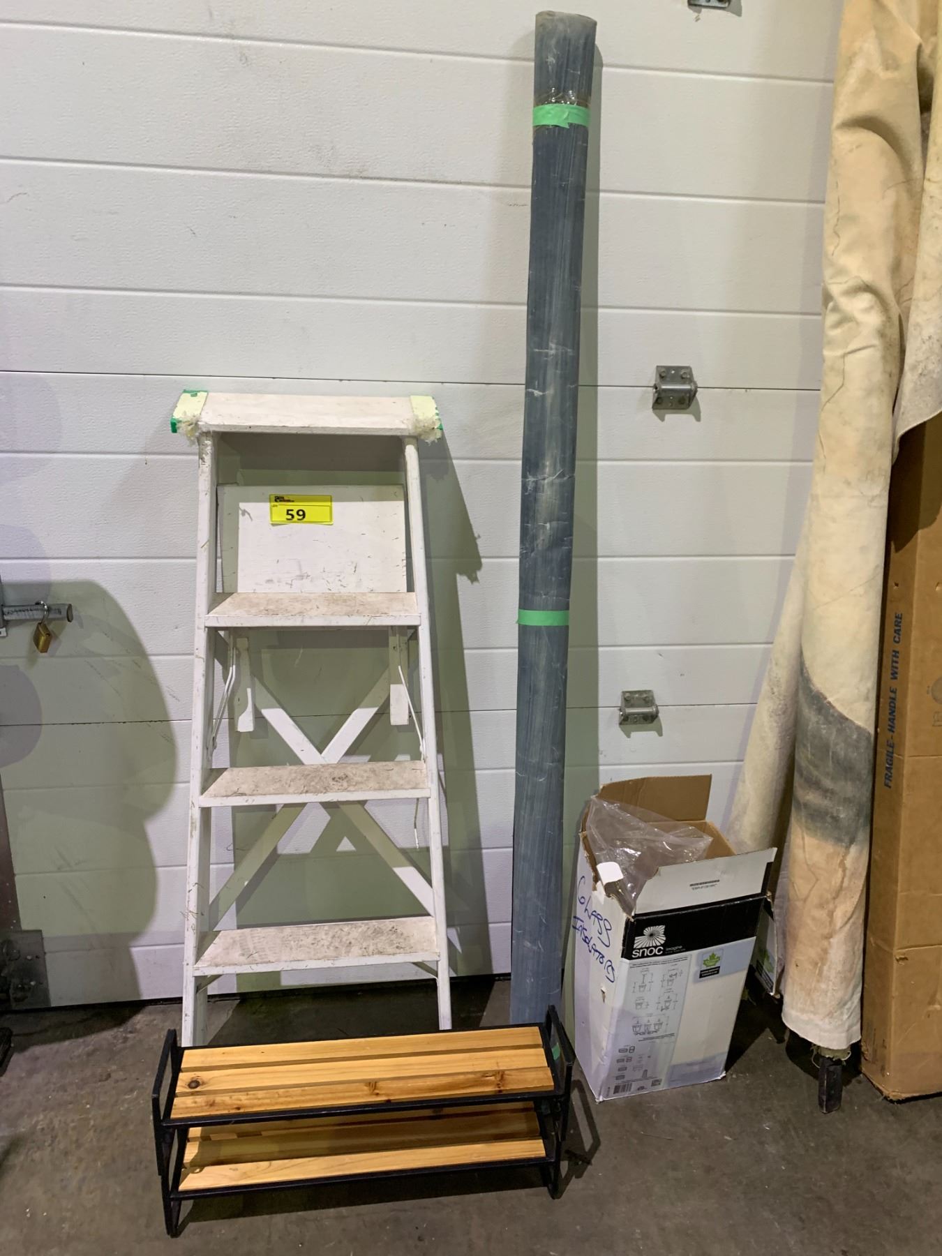 ASSORTED ITEMS INCLUDING; WOOD STEP LADDER, BOX OF GLASS INSULATORS, KITCHEN COUNTER SHELVES & MORE