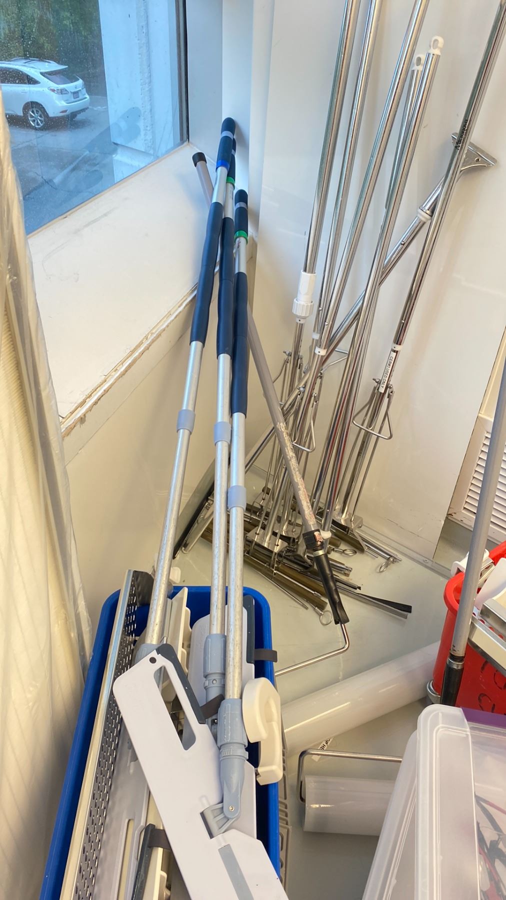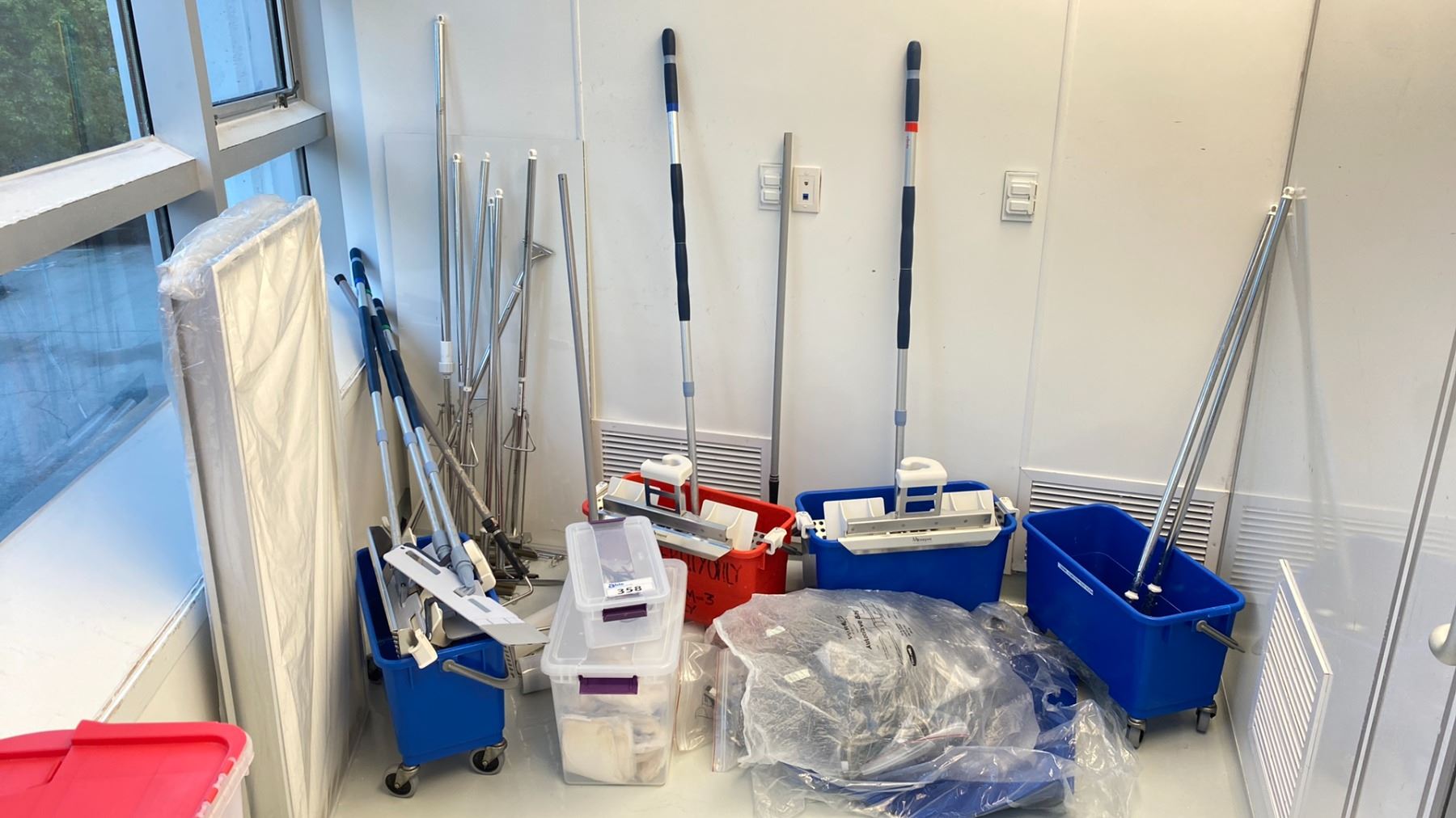 ASSORTED JANITORIAL SUPPLIES; MOP BUCKETS, SQUEEGEES, FLOOR STICKY ROLLERS AND MORE