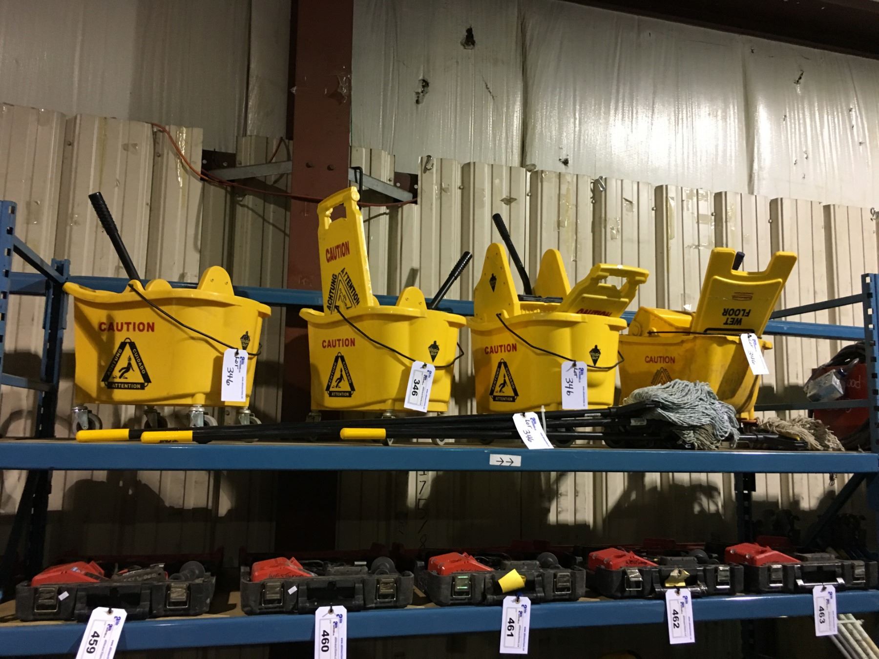 ASSORTED JANITORIAL SUPPLIES: MOPS, BUCKETS & WET FLOOR SIGNS