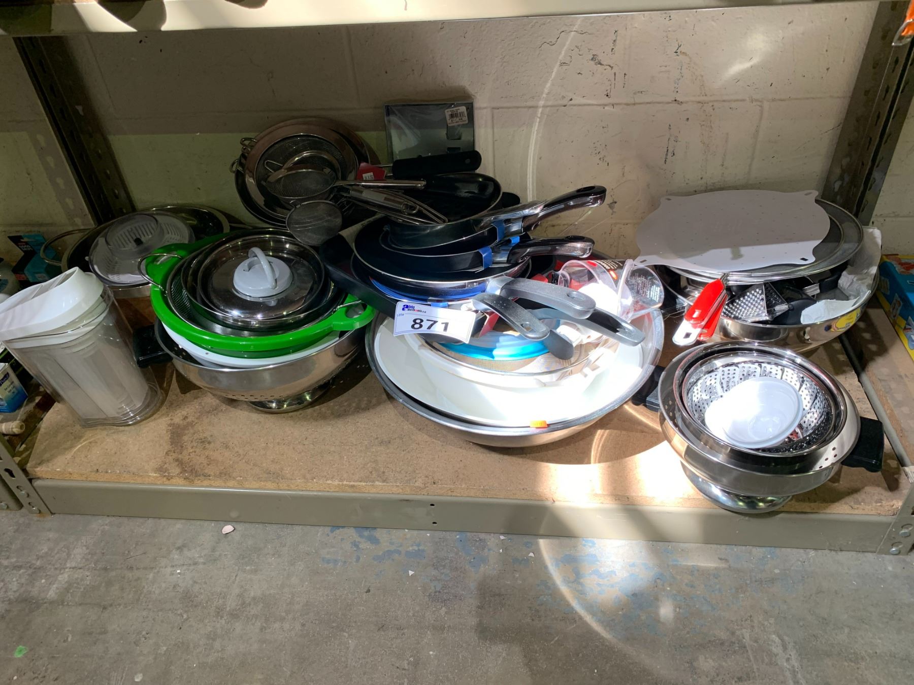ASSORTED KITCHENWARE (SOME NEW) INCLUDING; TFAL PANS, MIXING BOWLS, COLANDERS & MORE