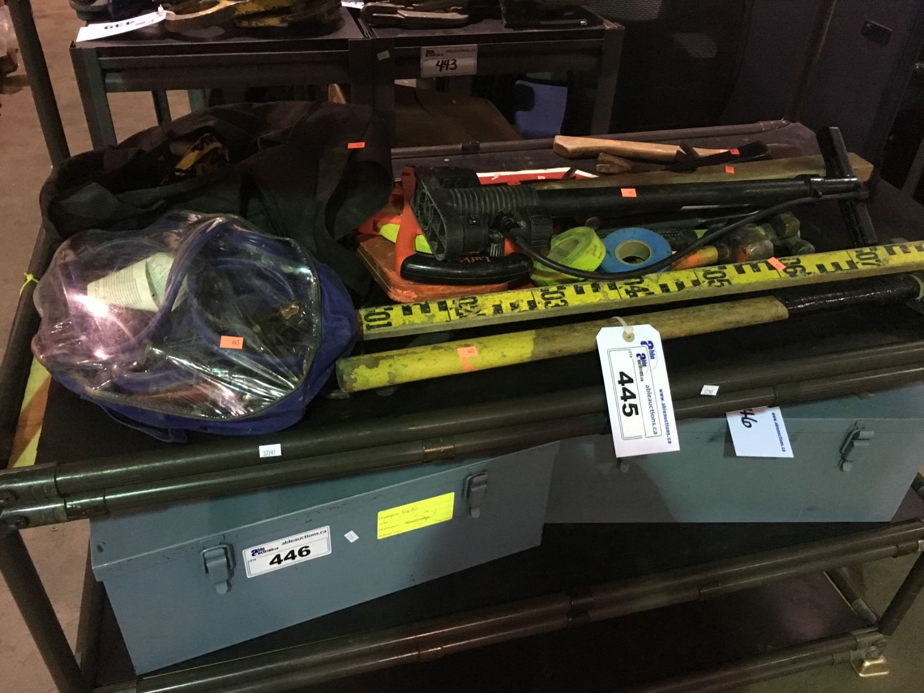 ASSORTED LARGE TOOLS, JUMPER CABLES, STOP SIGN & PUMP