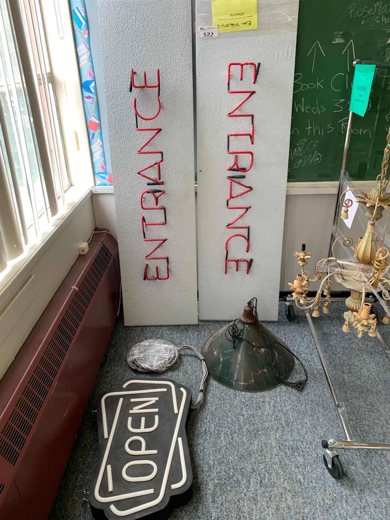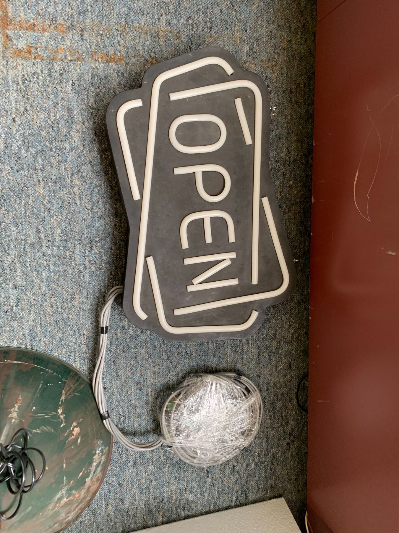 ASSORTED LIGHTING INCLUDING; NEON ENTRANCE SIGNS, NEON OPEN SIGN & HANGING LAMP