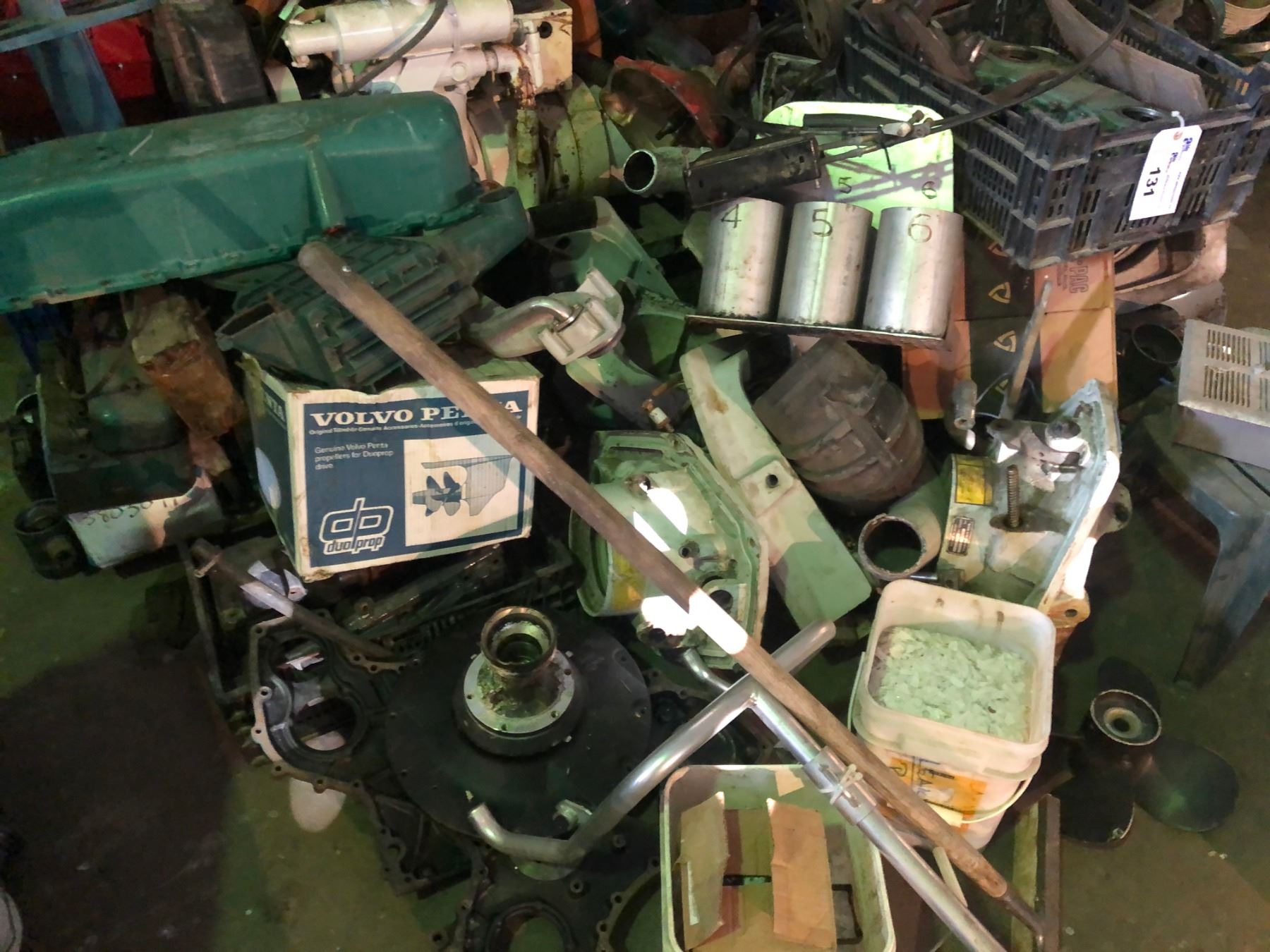 ASSORTED MARINE ENGINE PARTS IN FRONT OF RACKING