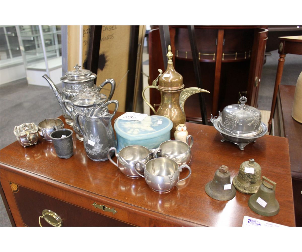 ASSORTED METAL TEA POTS AND CUPS AND CAMEO JEWELLRY BOX