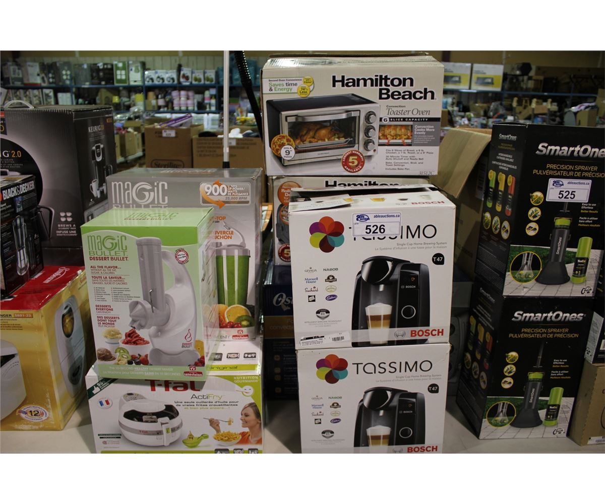 ASSORTED OPEN BOX SMALL APPLIANCES: 2 HAMILTON BEACH TOASTER, OSTER TOASTER, 2 TASSIMO COFFEE MAKERS, MAGIC BULLET, DESSERT BULLET, T-FAL FRYER, CONAIR STEAMER