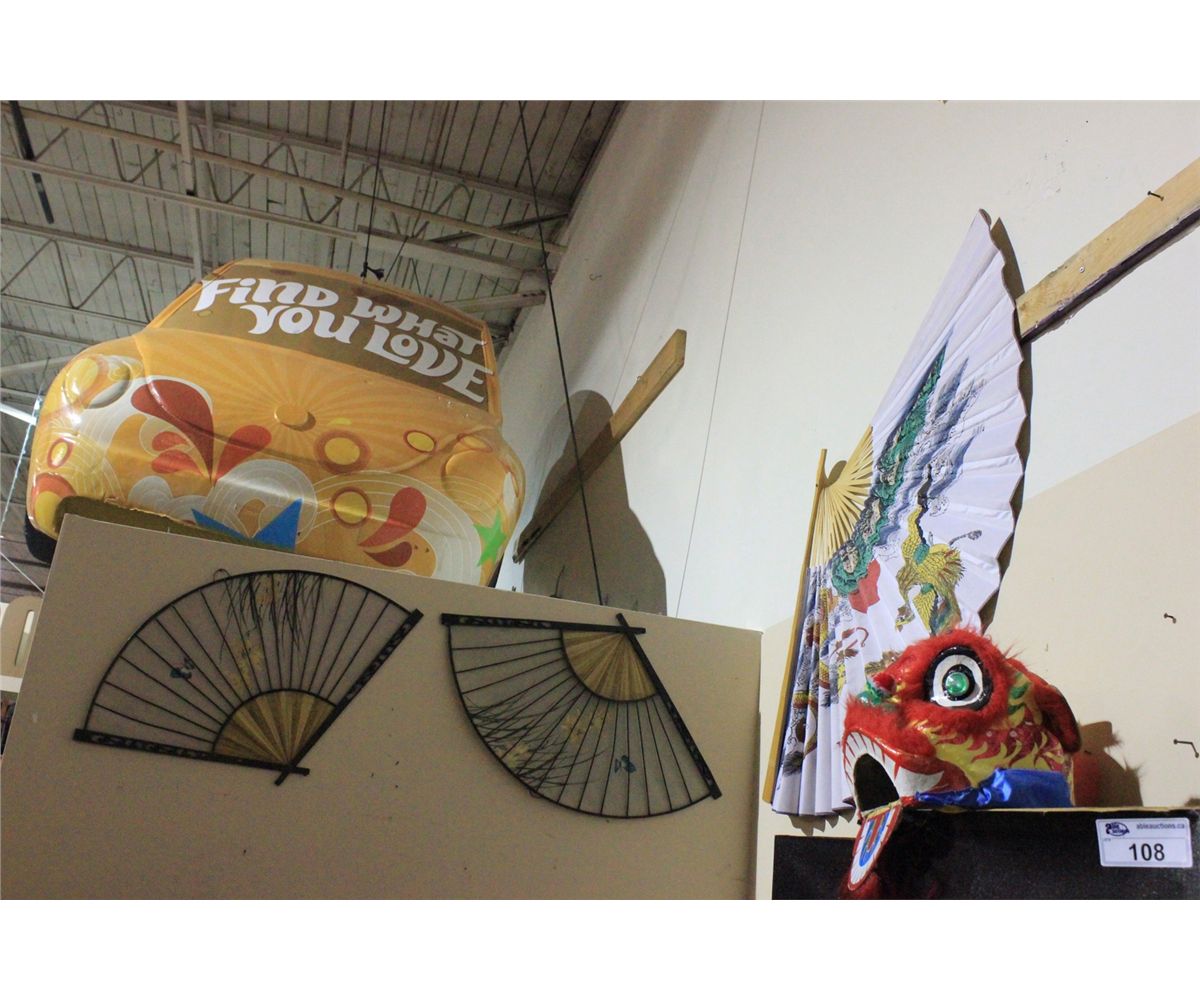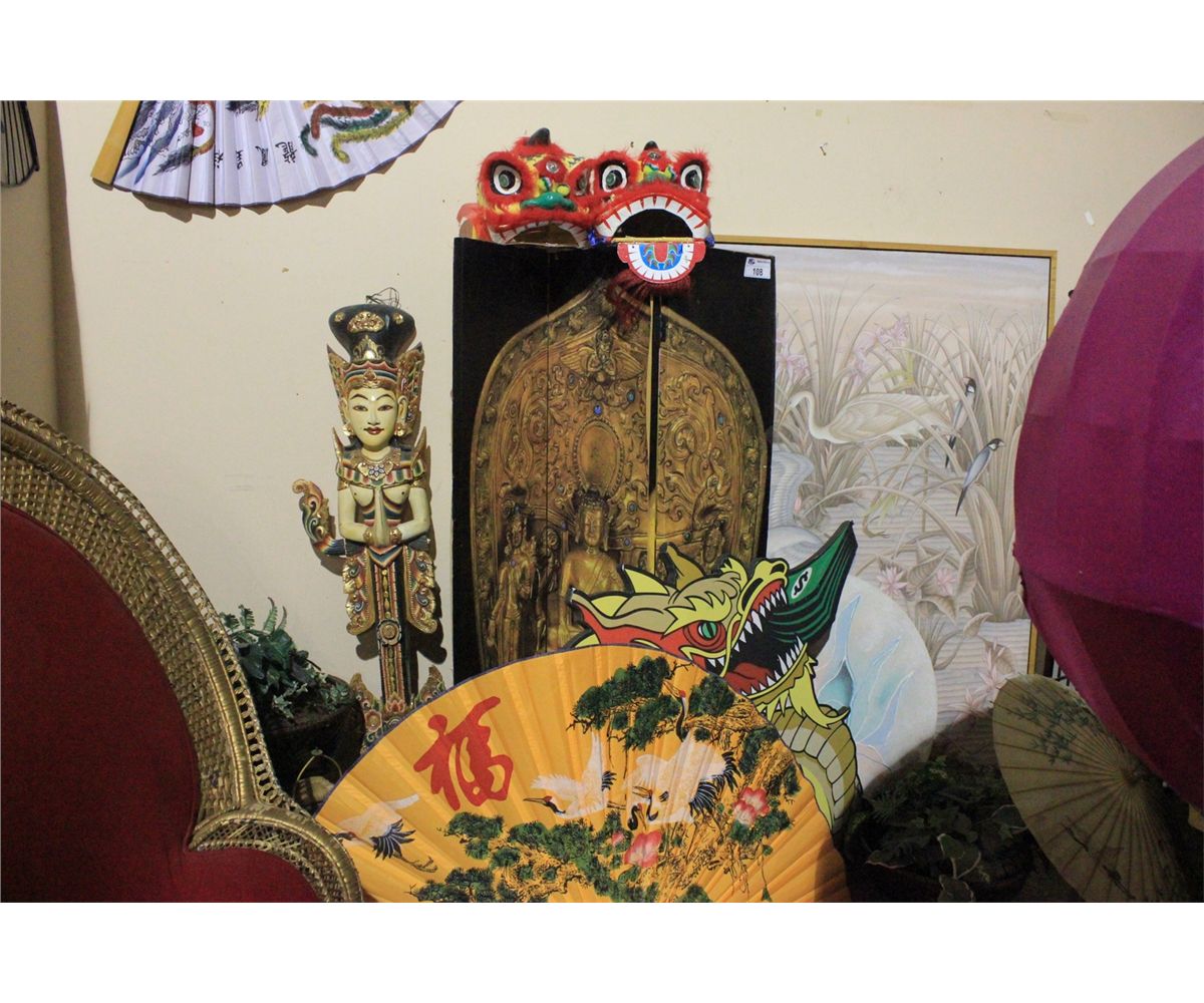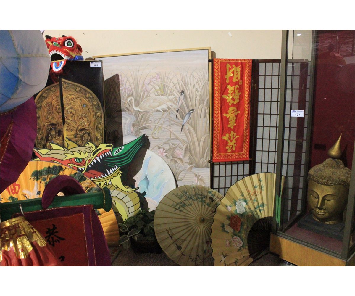 ASSORTED ORIENTAL DECOR ITEMS WITH FANS ON WALL
