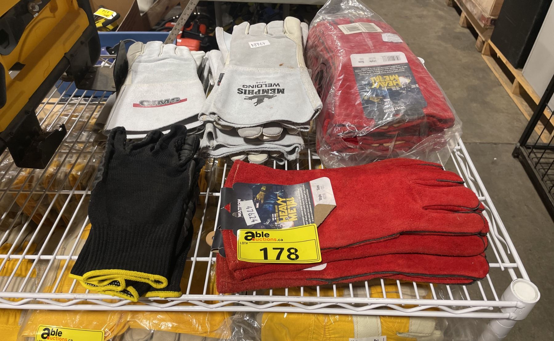 ASSORTED PAIRS OF HEAVY METAL WELDING GLOVES, GREY WELDING GLOVES, & BLACK RUBBER PALM WORK GLOVES