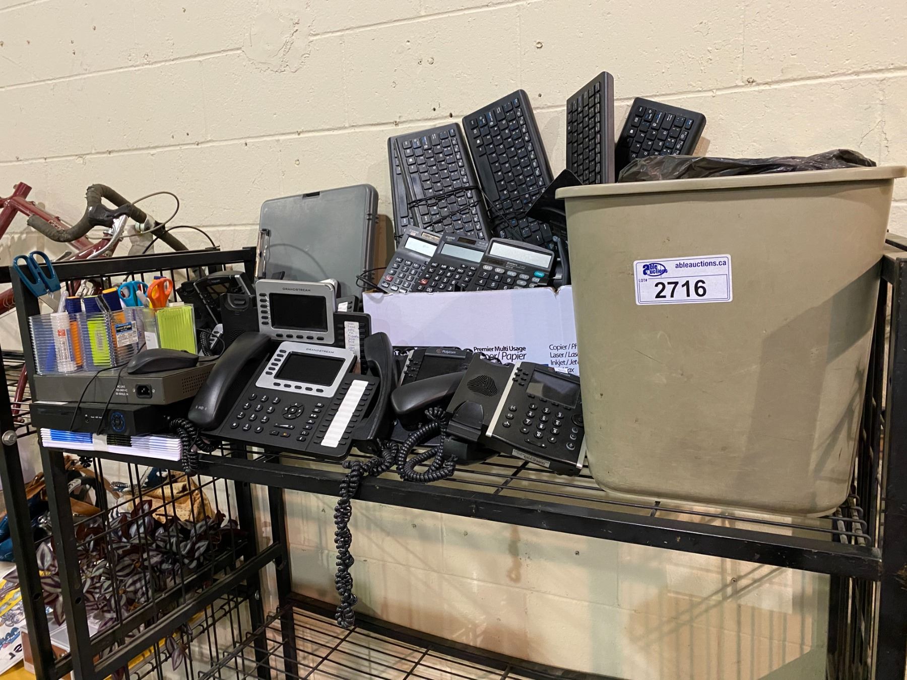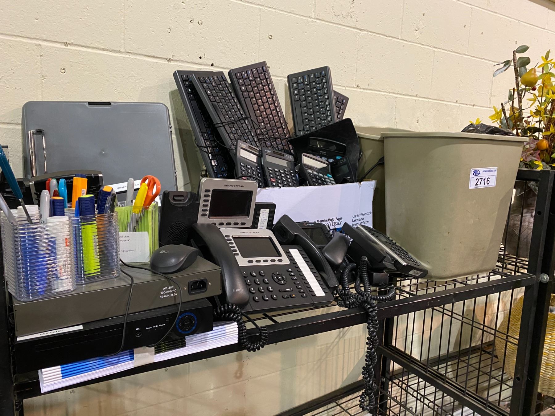 ASSORTED PHONES, TRASH BIN, OFFICE SUPPLIES, KEYBOARDS, & MORE
