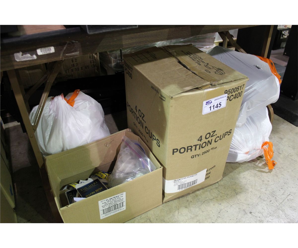 ASSORTED PORTION CUPS, STICKERS AND VENDING MACHINE PARTS