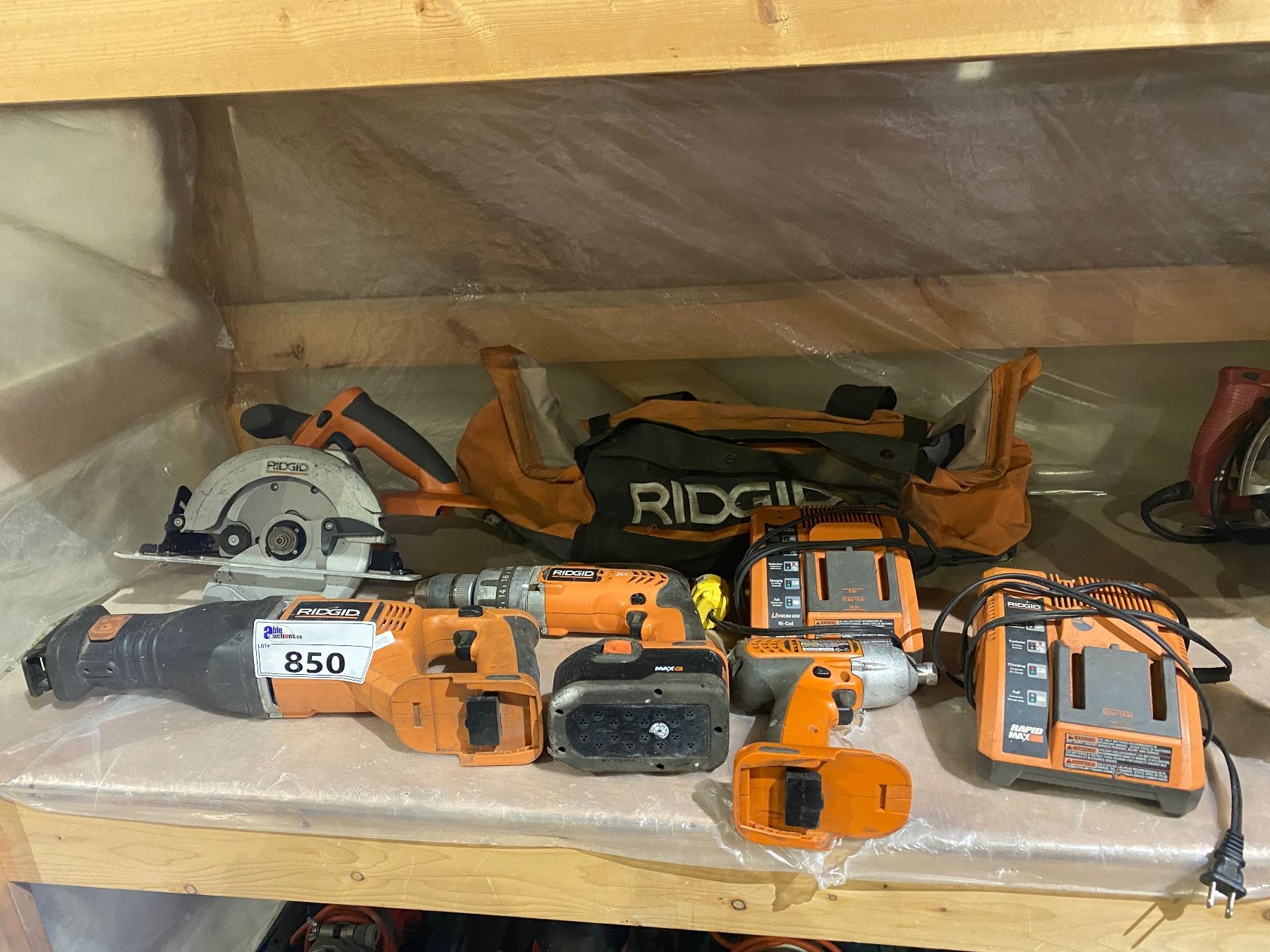 ASSORTED RIGID PRODUCTS: SAWZALL, DRILLS, 1 BATTERY, 2 BATTERY CHARGERS, CIRCULAR SAW, & TOOL BAG