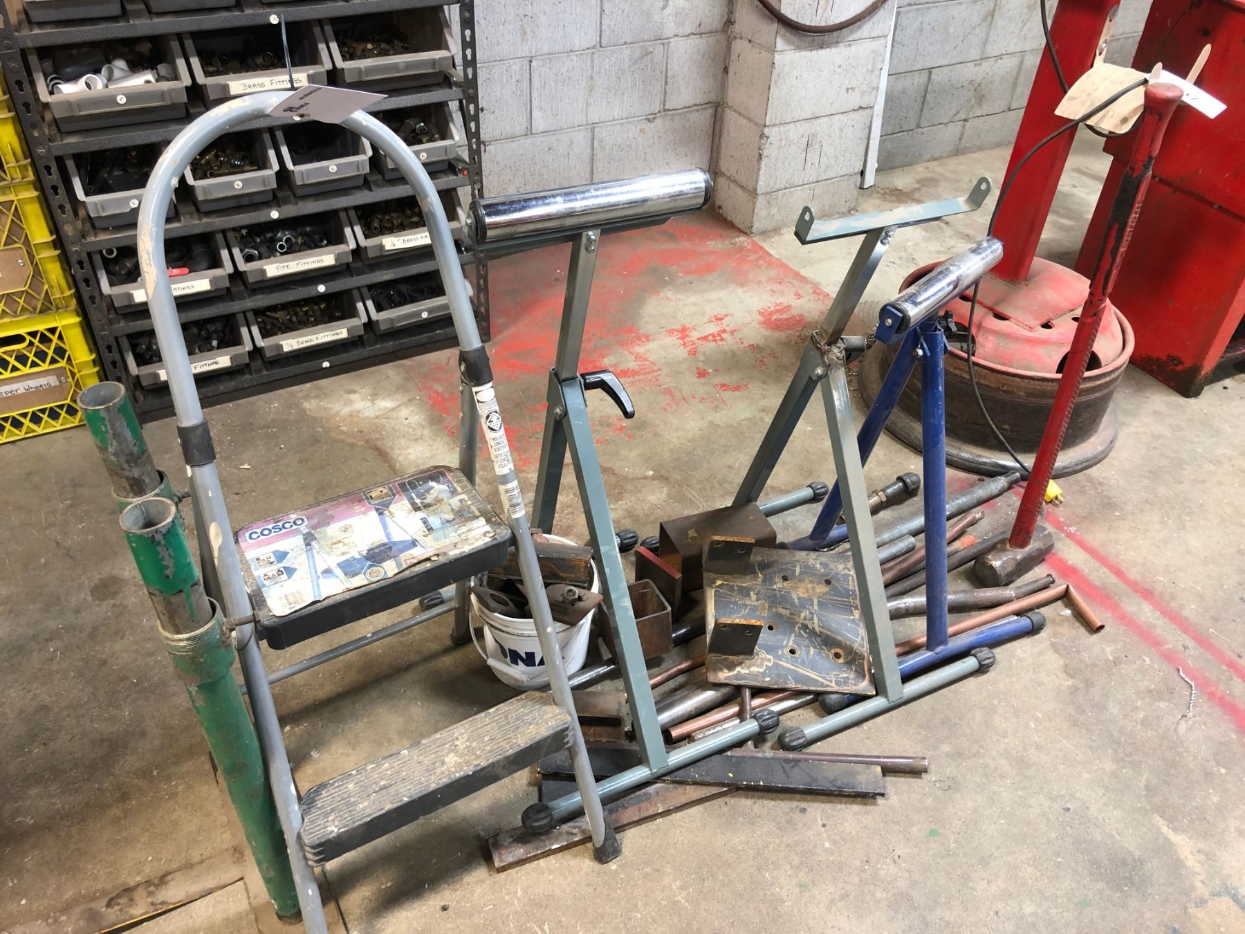 ASSORTED ROLLER STANDS, COPPER PIPE, SLEDGEHAMMER & STEP STOOL