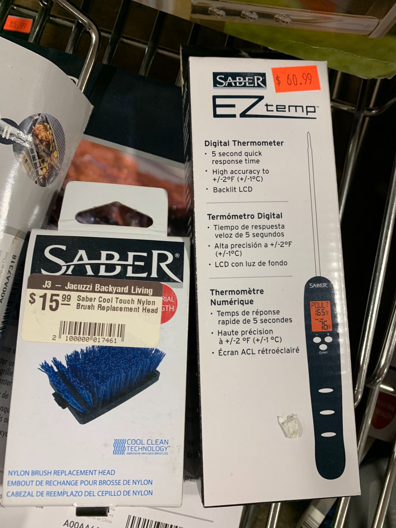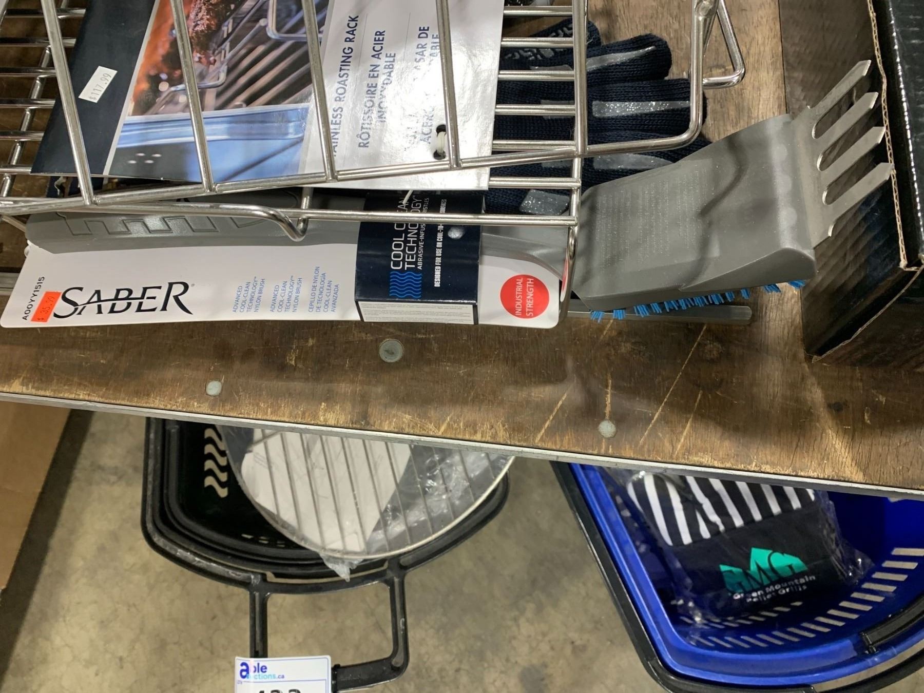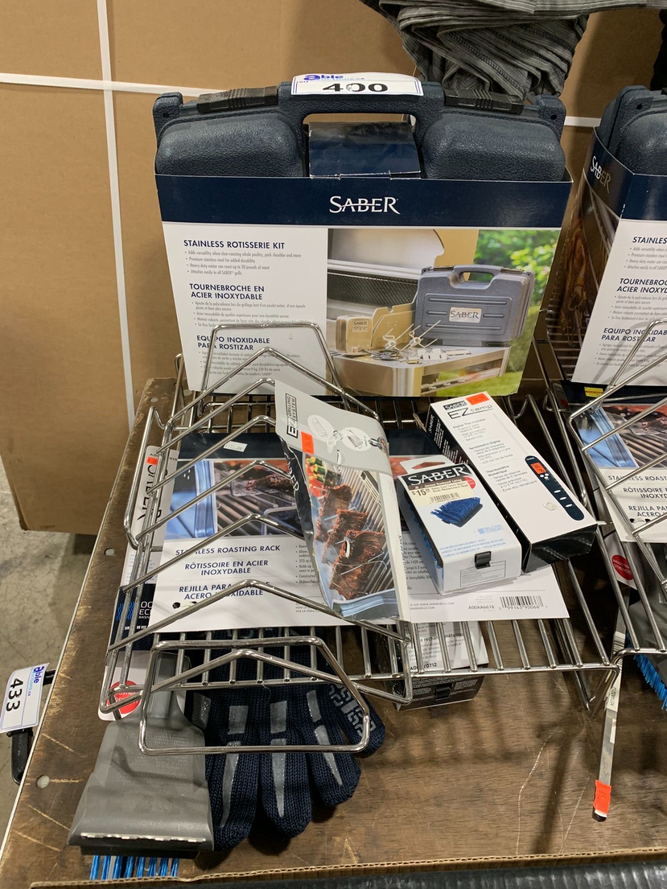 ASSORTED SABER BRANDED GRILLING ACCESSORIES INCLUDING: ROTISSERIE KIT, ROTISSERIE BAR, 2 COOKING RACKS, EZ TEMP THERMOMETER, GLOVES, SCRAPER, REPLACEMENT HEAD, & METAL SCRUBBER