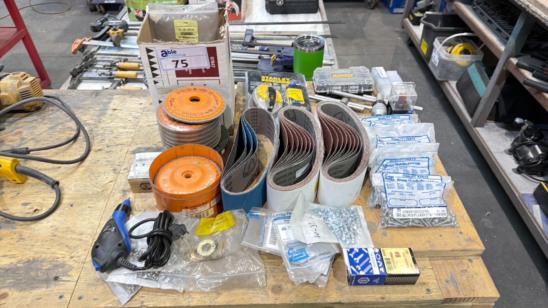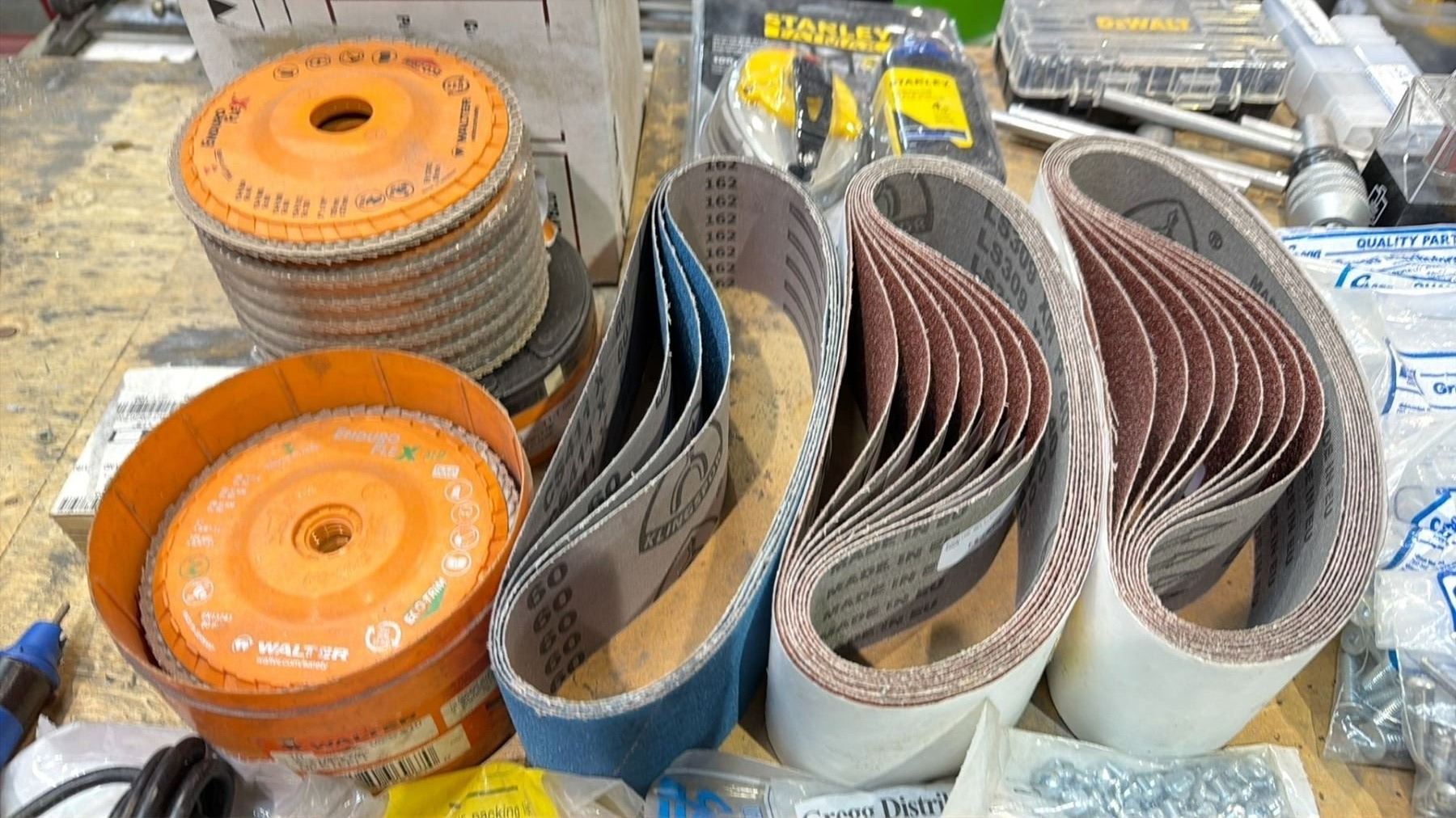 ASSORTED SANDING BELTS, GRINDING DISCS AND HARDWARE