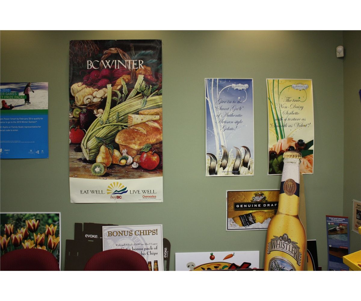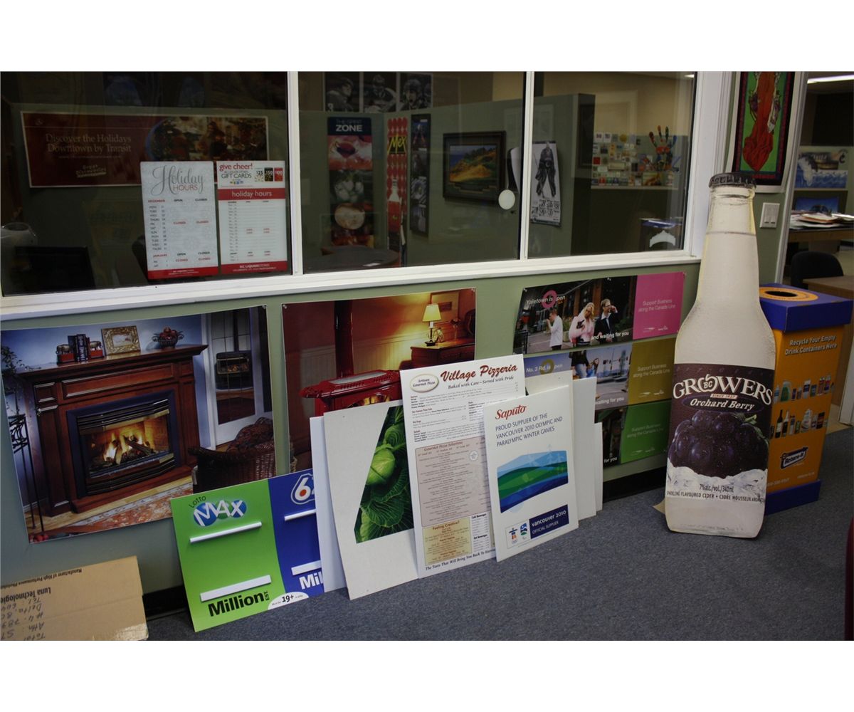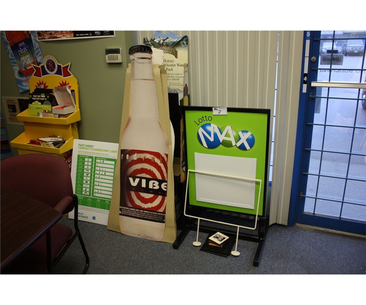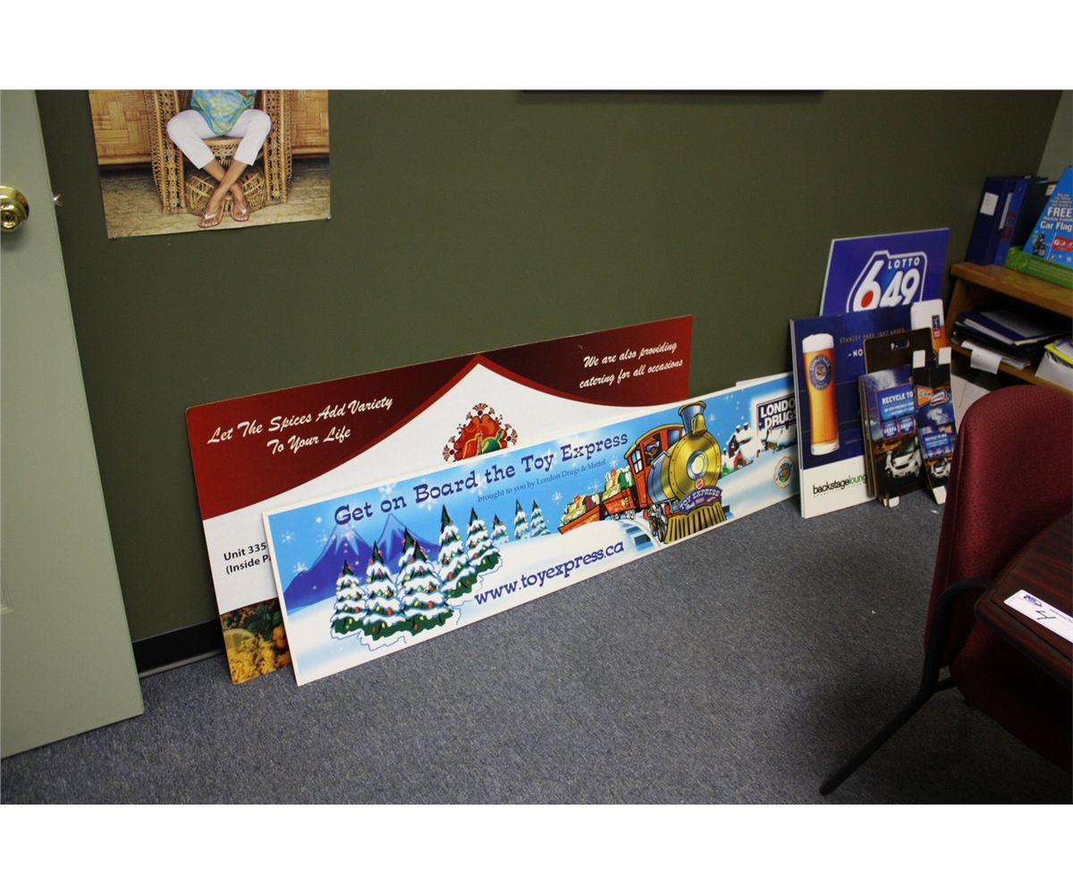 ASSORTED SIGNAGE AND POSTERS IN BOARDROOM INCLUDING STANDUPS AND SIGN HOLDERS