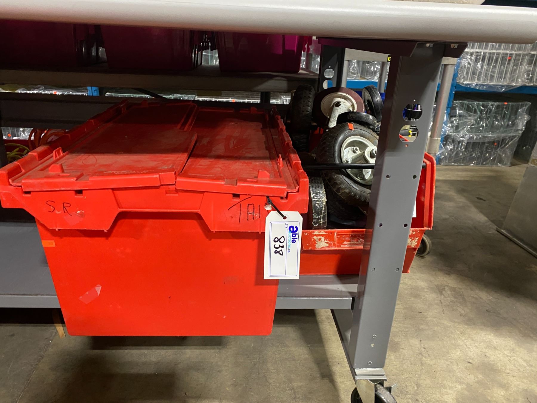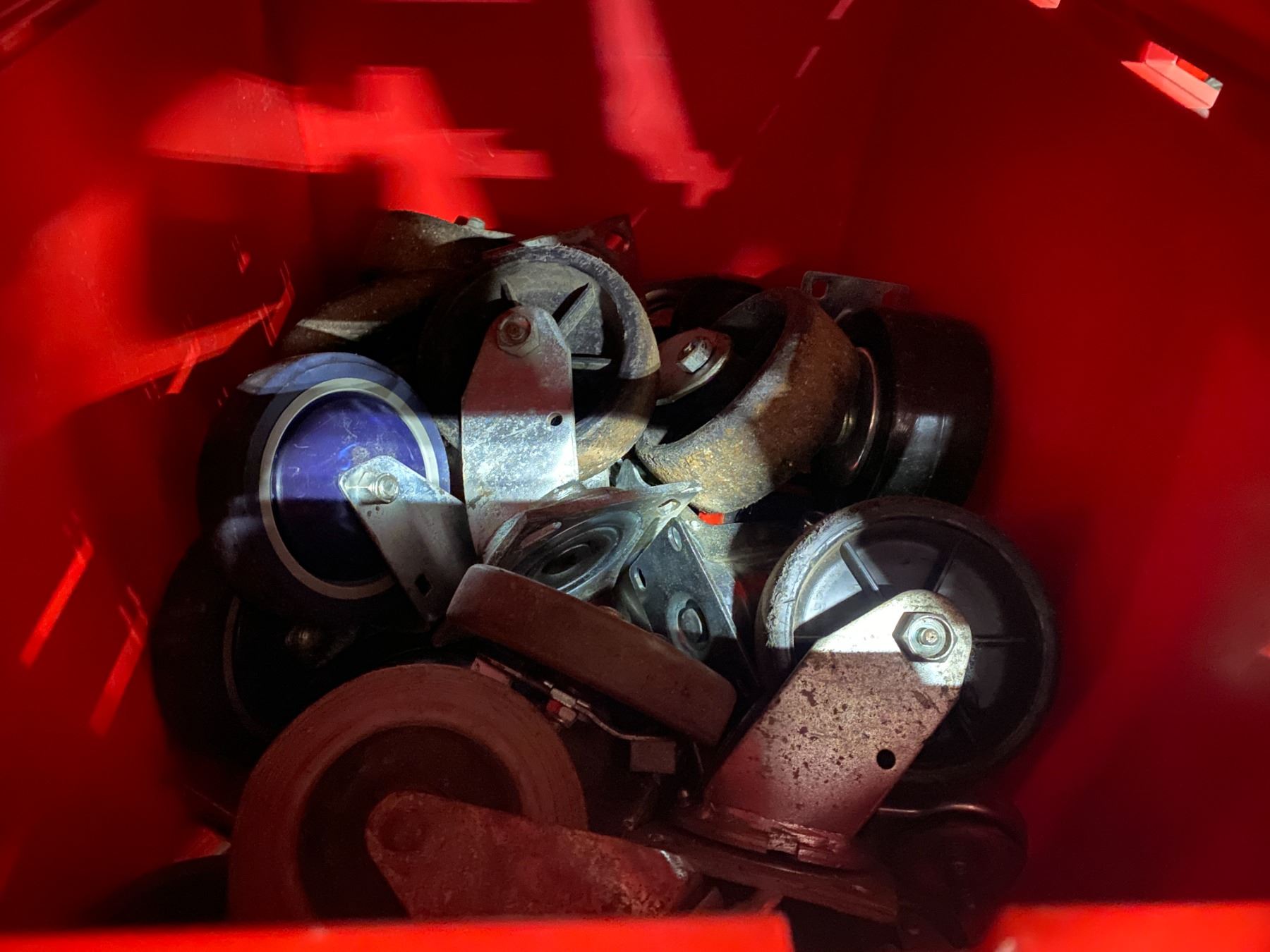 ASSORTED SIZED COMMERCIAL REPAIR CASTERS IN PLASTIC FOLD TOP BINS *BINS INCLUDED*