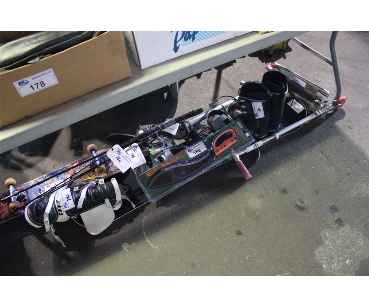 ASSORTED SNOW BOARD, SKATE BOARD, FISHING RODS ETC.
