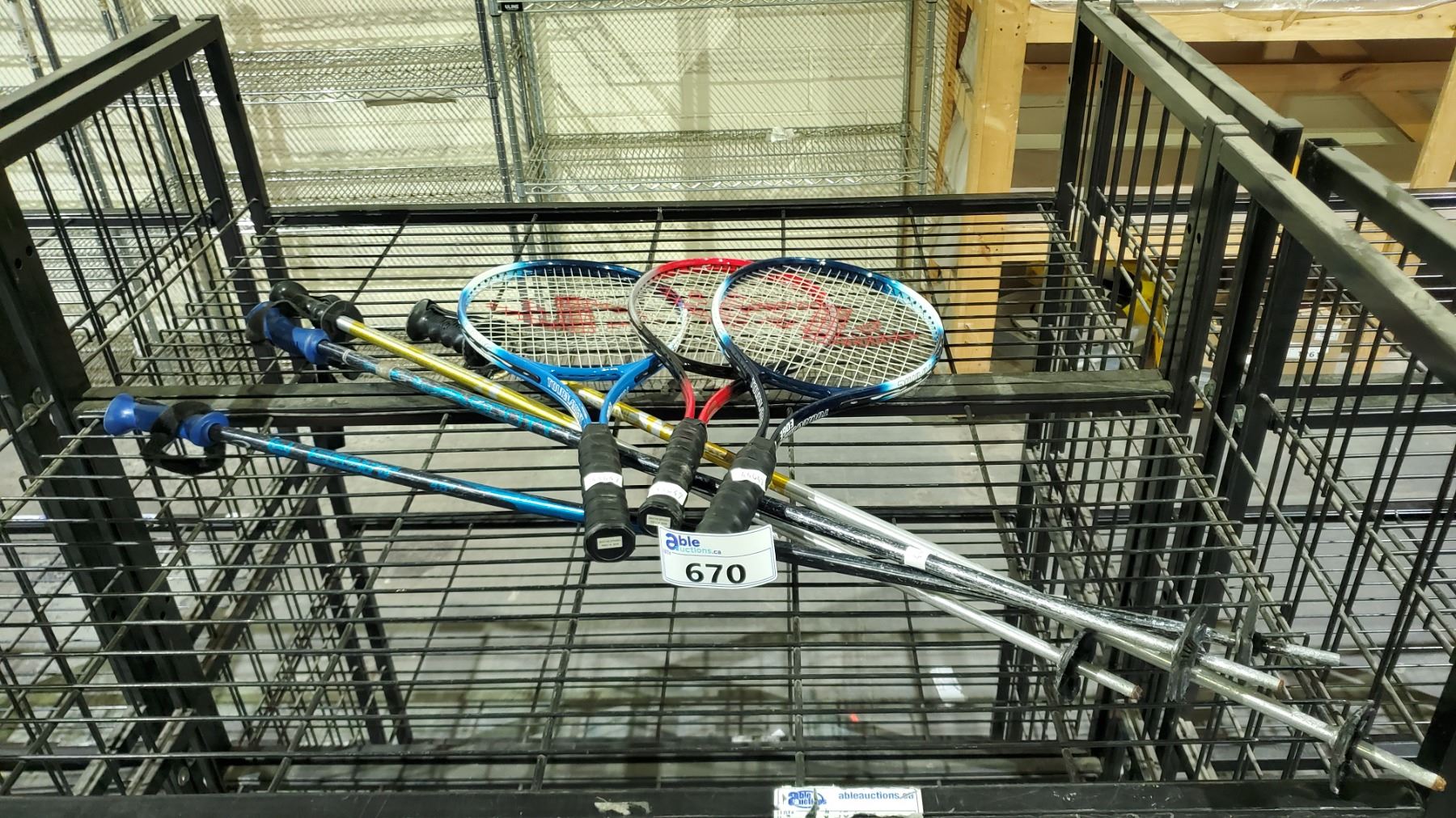 ASSORTED SPORTS EQUIPMENT INCLUDING; TENNIS RACKETS & SKI POLES