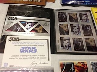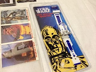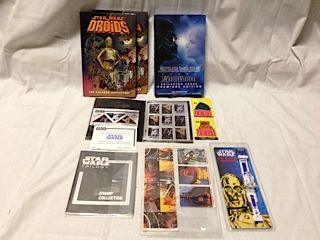 ASSORTED STAR WARS COLLECTABLE ITEMS INCLUDING R2D2 WRIST WATCH, 2 STAMP COLLECTIONS WITH C.O.A., 2 BOOKS & ASSORTED TRADING CARDS