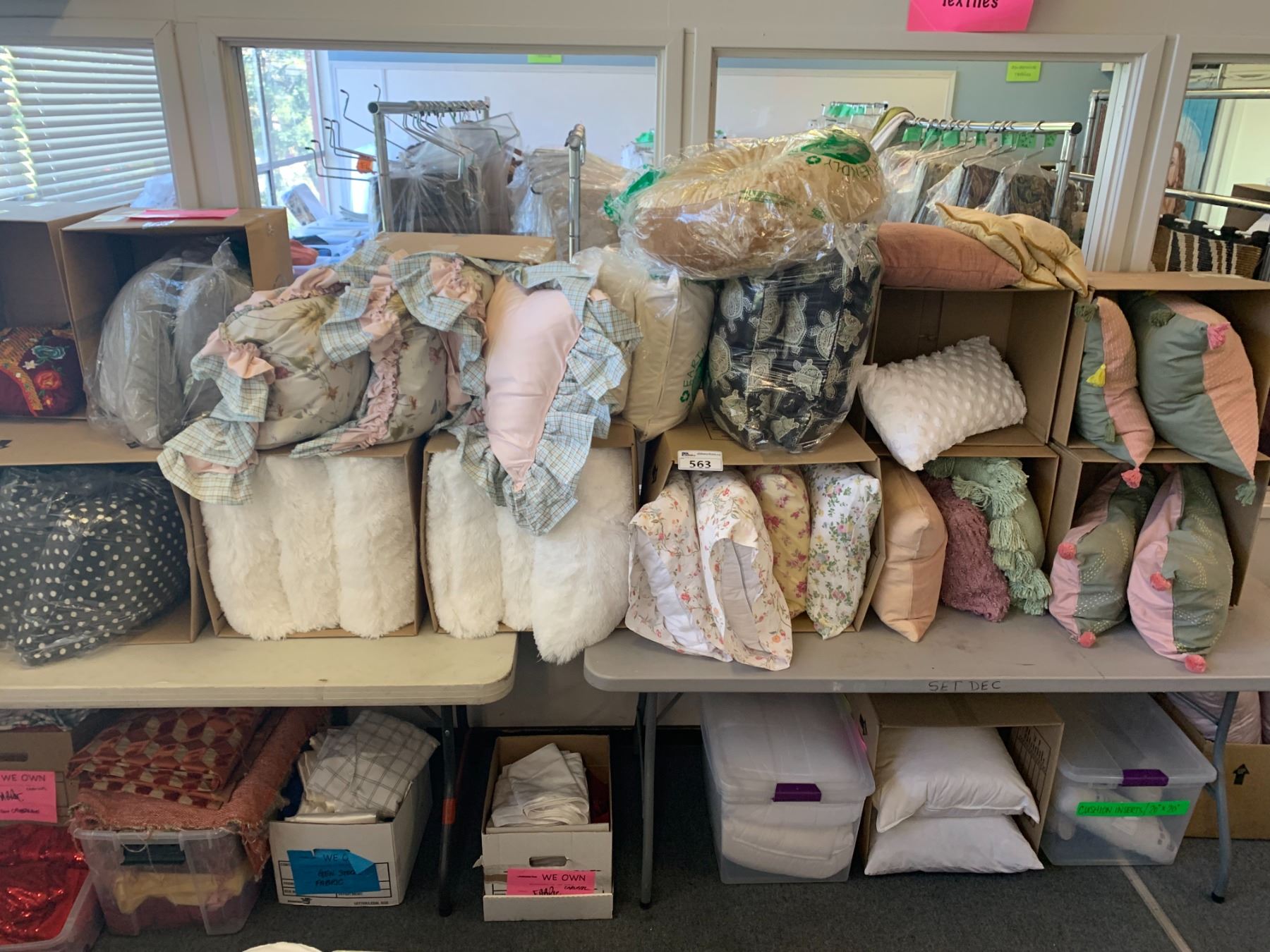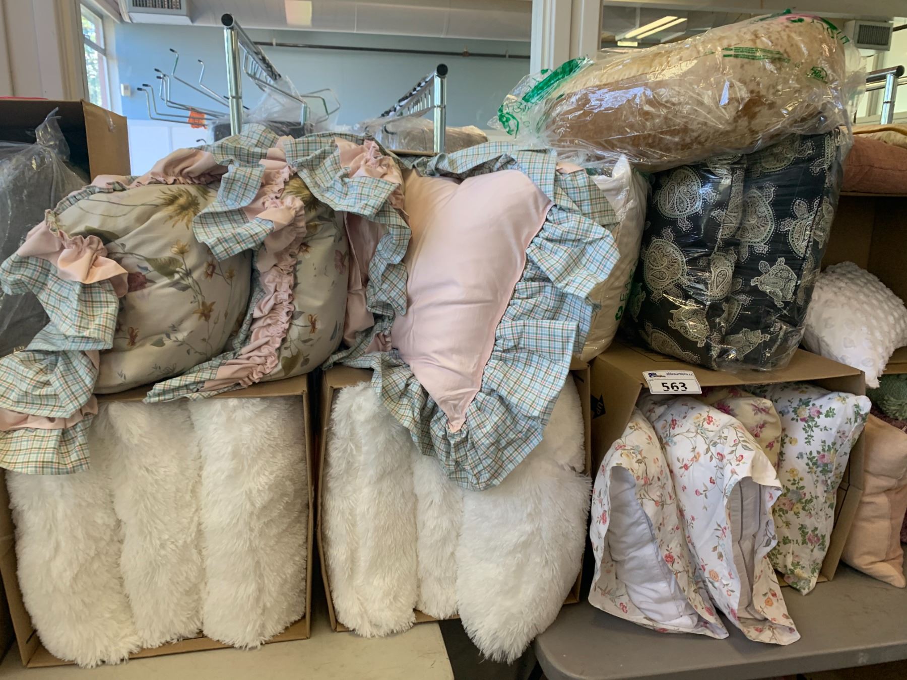 ASSORTED TEXTILES INCLUDING; THROW PILLOWS, FABRIC, STUFFED BEAR PARTS & MORE (TABLES NOT INCLUDED)
