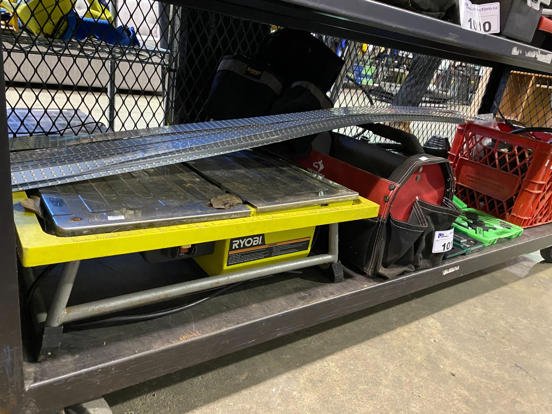 ASSORTED TOOLS, AIR PUMP, RYOBI SAW STAND, & MORE