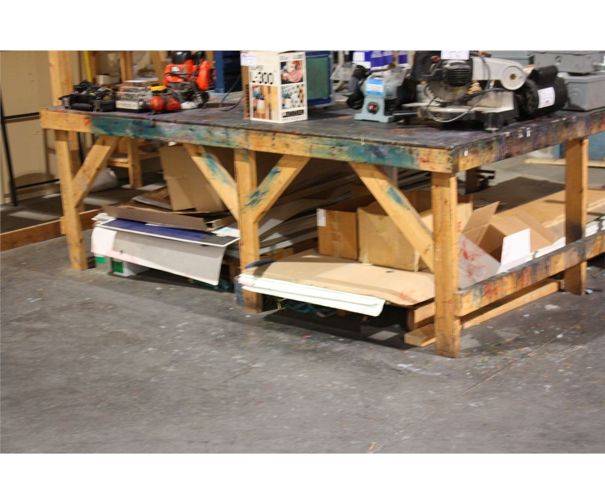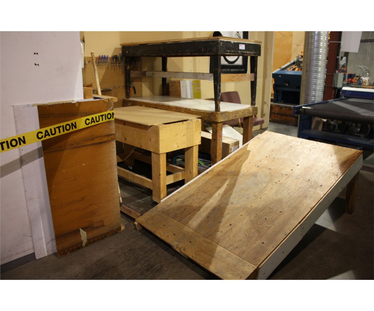 ASSORTED TOOLS AND WOODEN LAYOUT TABLE, CHAIRS AND MISC