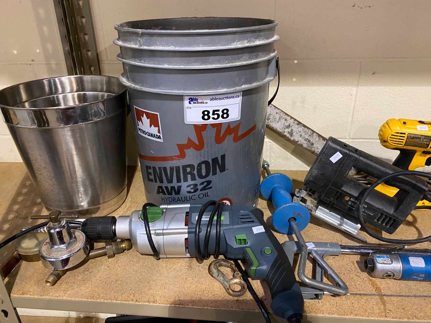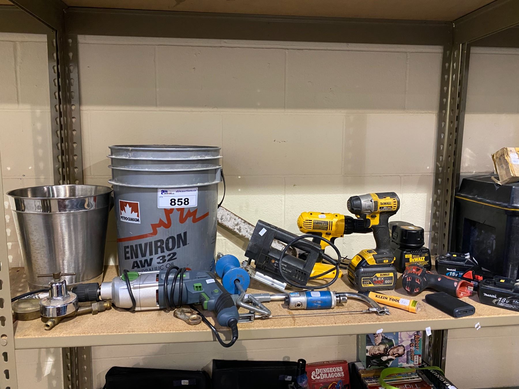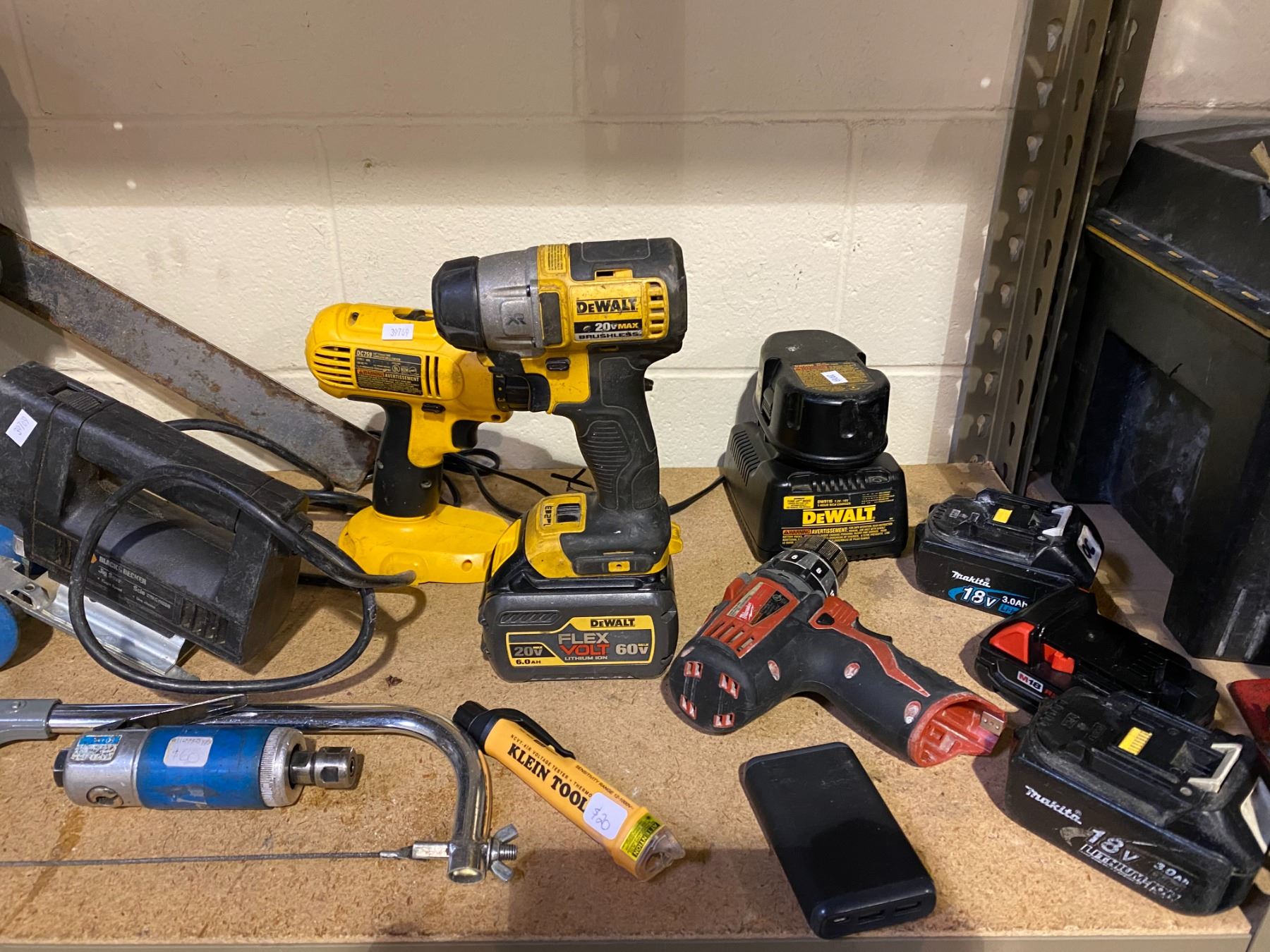 ASSORTED TOOLS INCLUDING: DEWALT POWER TOOLS, DEWALT BATTERIES + CHARGER, MILWAUKEE DRILL, BUCKETS, & MORE