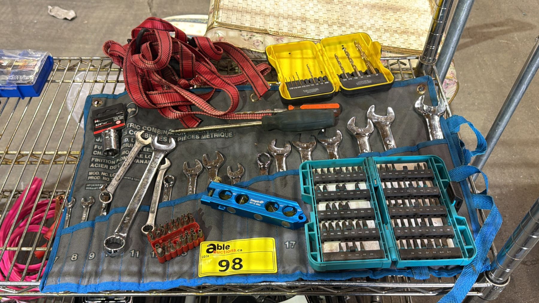 ASSORTED TOOLS INCLUDING; DRILL BIT SETS, WRENCH SET, LEVEL, RATCHET STRAP & MORE