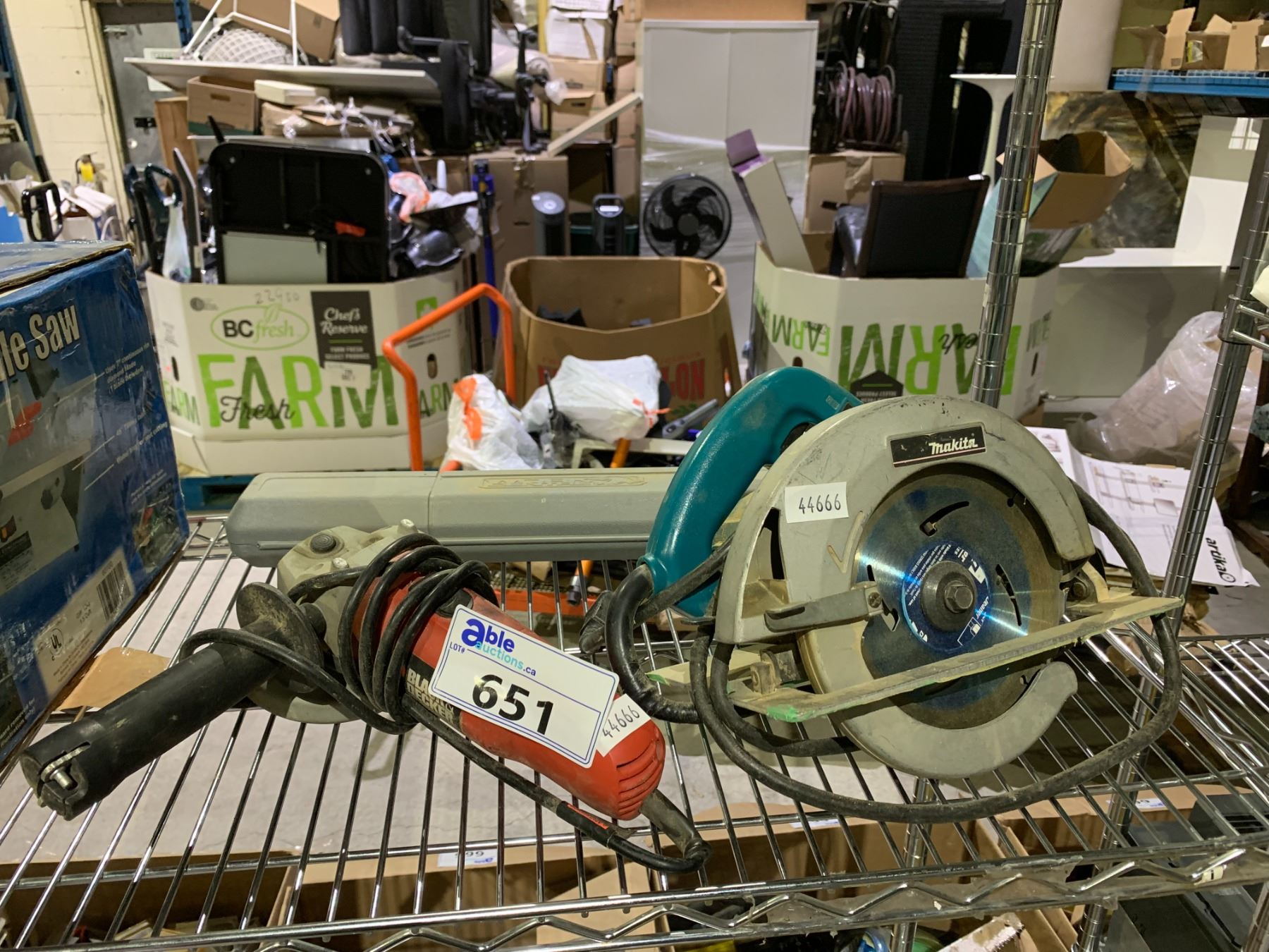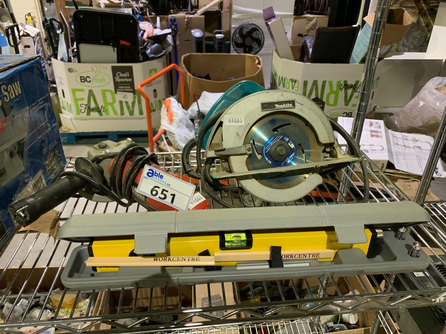 ASSORTED TOOLS INCLUDING; MAKITA CIRCULAR SAW, BLACK & DECKER ANGLE GRINDER & LEVEL