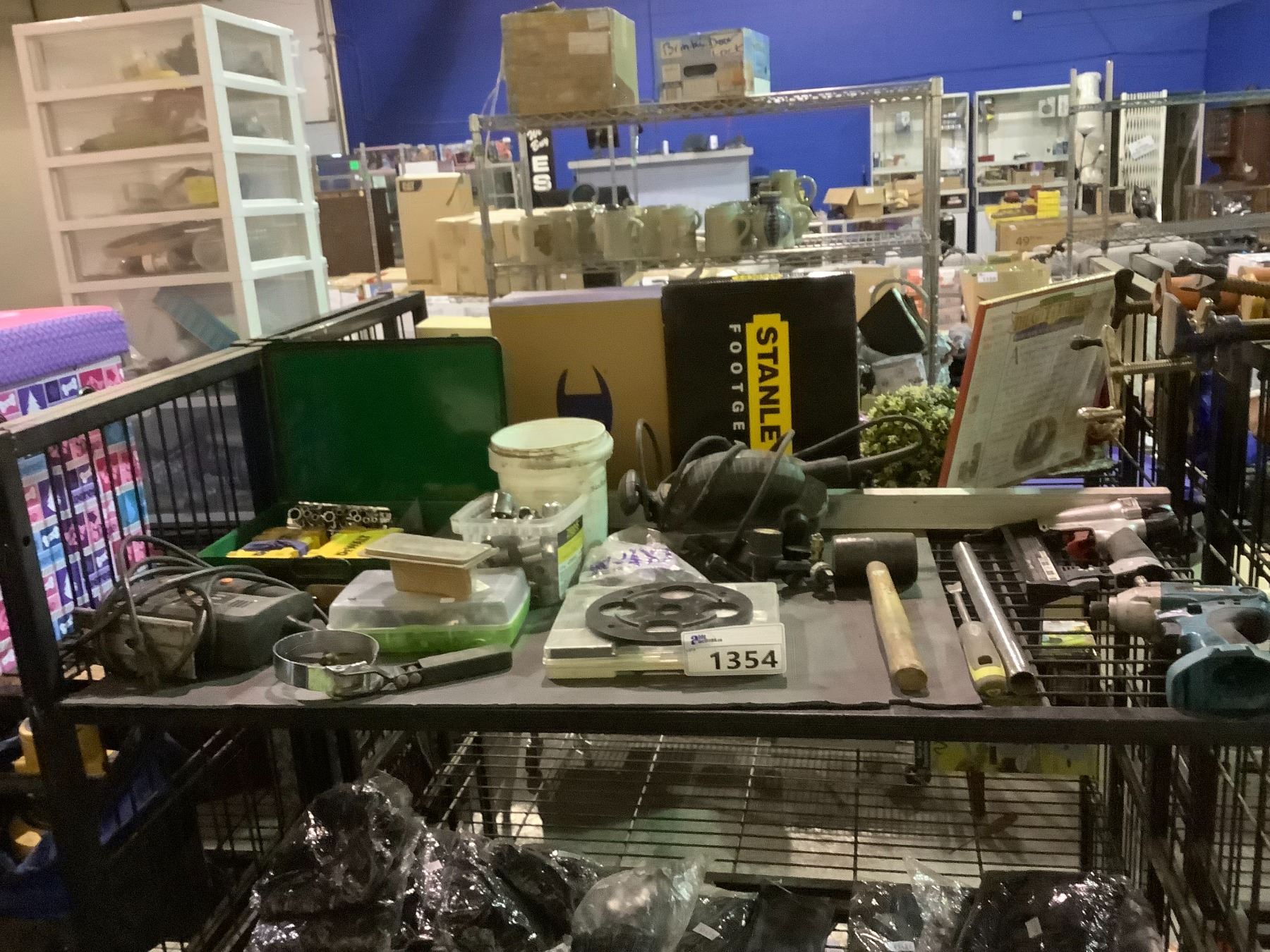 ASSORTED TOOLS INCLUDING: MAKITA CORDLESS DRILL (NO BATTERY), NAIL GUN, MALLET, & MORE