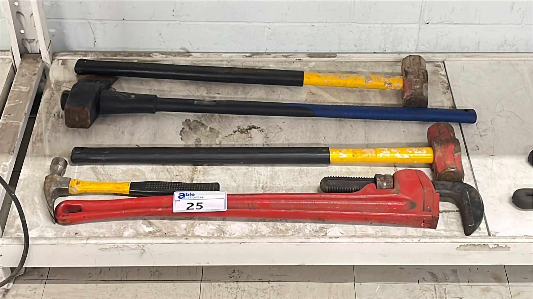 ASSORTED TOOLS INCLUDING; PIPE WRENCH, HAMMERS & AXE