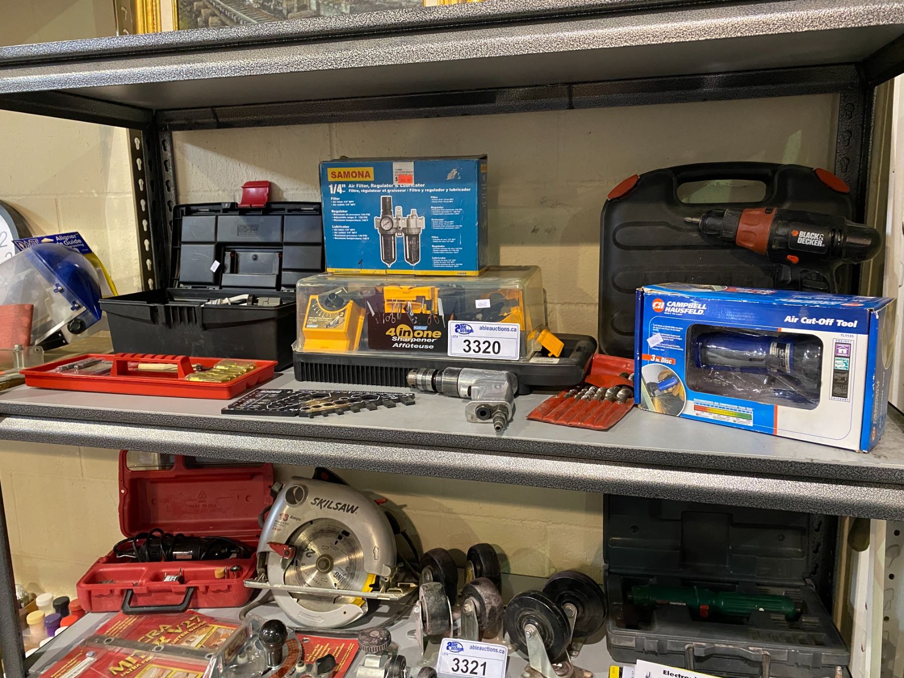 ASSORTED TOOLS, PNEUMATIC HAND TOOL, CAMPBELL HAUSFELD AIR CUT-OFF TOOL, & MORE
