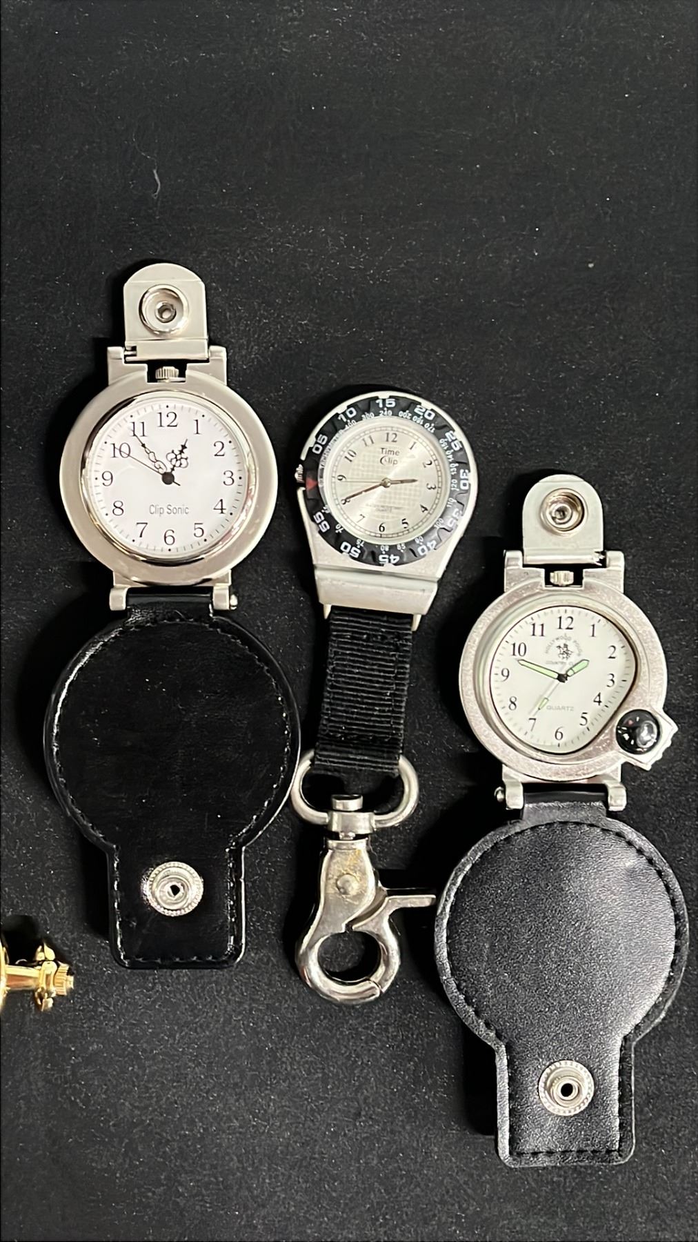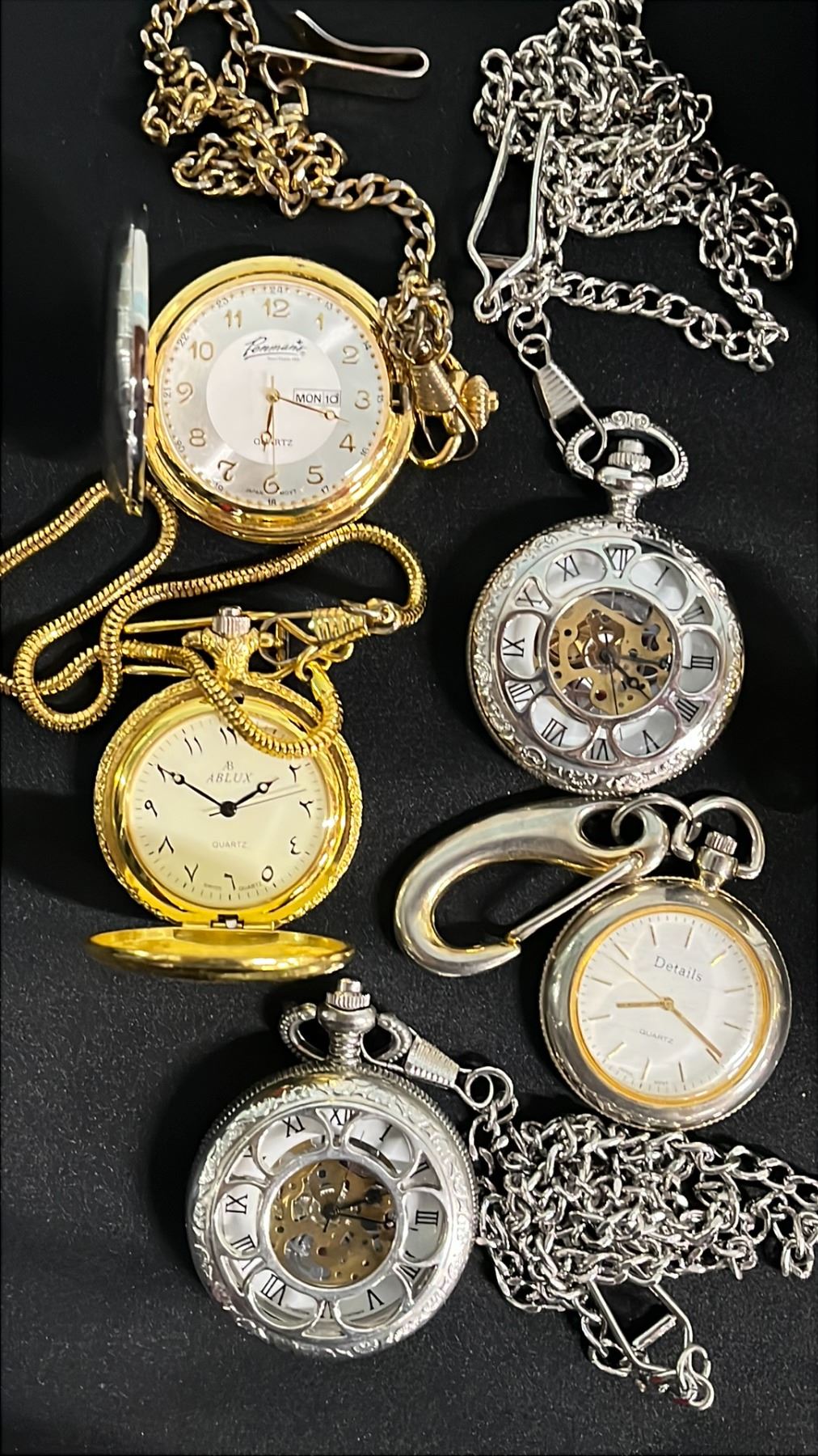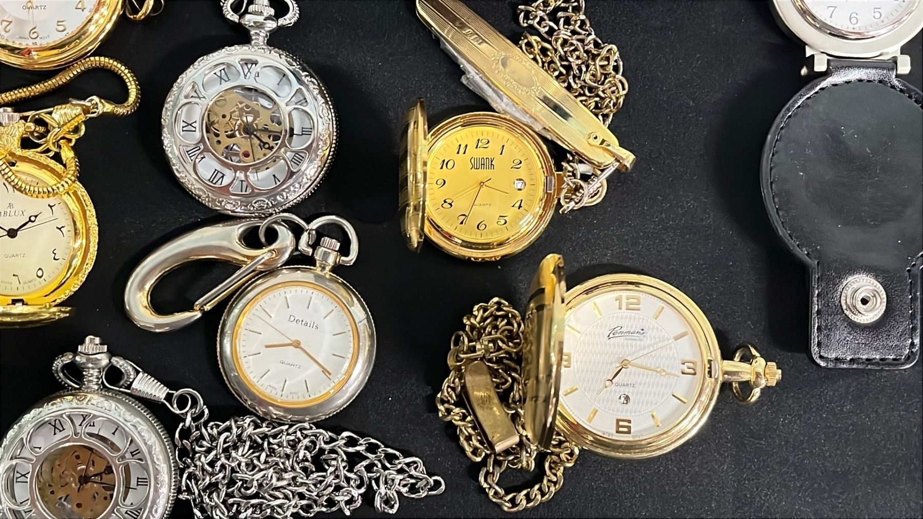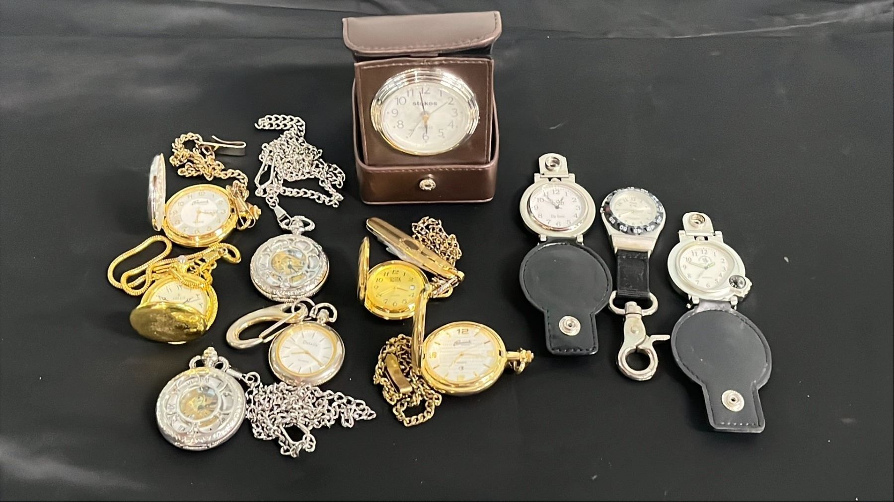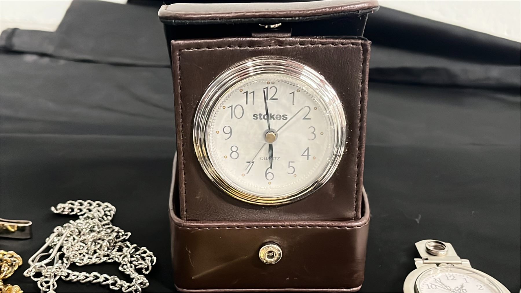 ASSORTED WATCHES & STOP WATCHES INCLUDING: STOKES DESK STAND CLOCK, SKELETON POCKET WATCHES, SWANK GOLD POCKET WATCH WITH CHAIN & MORE
